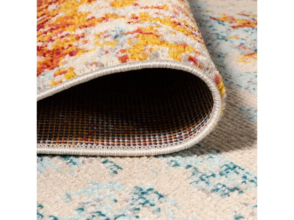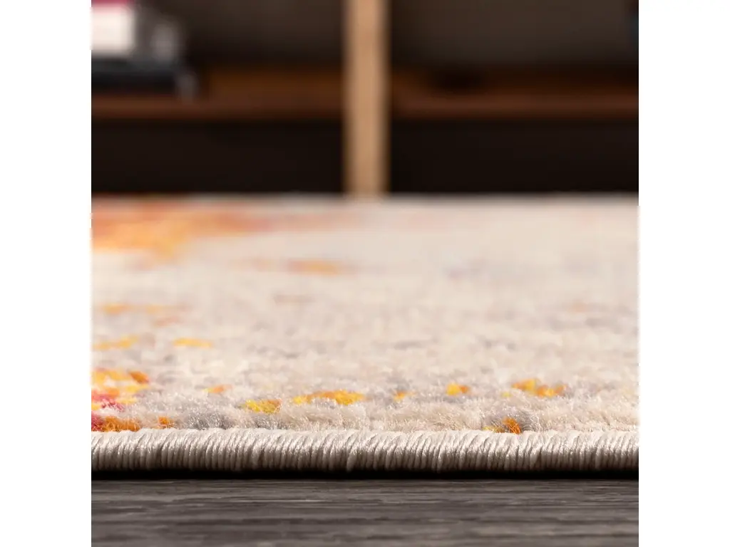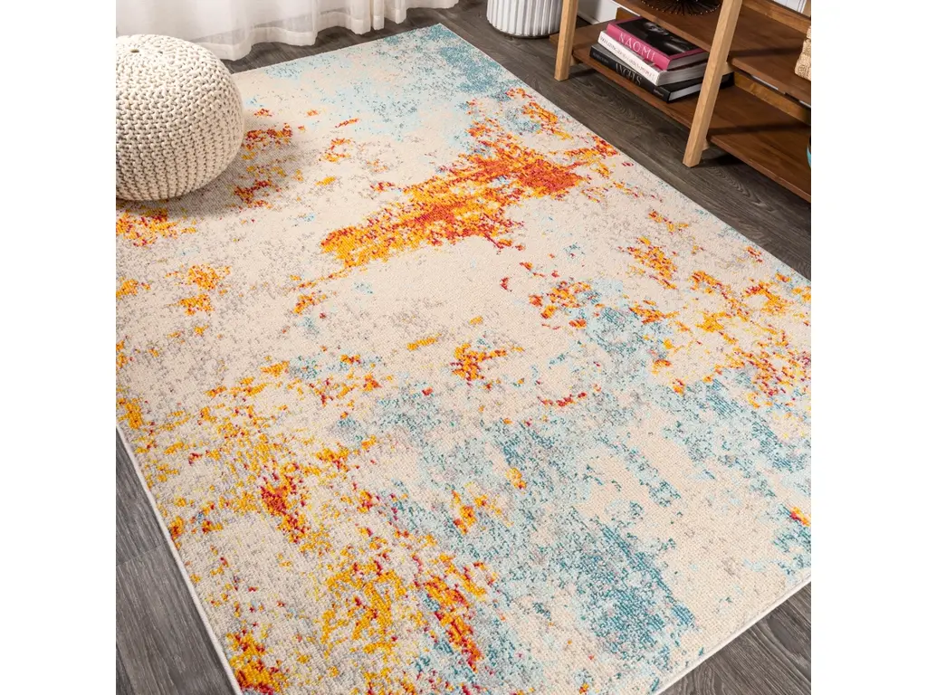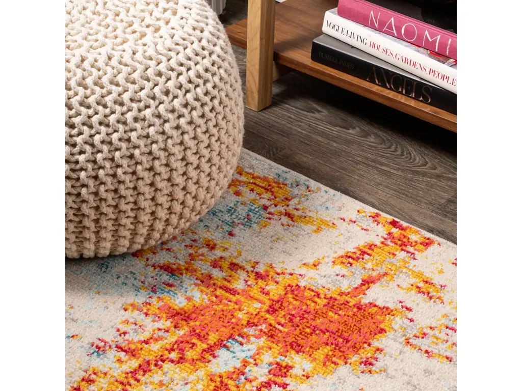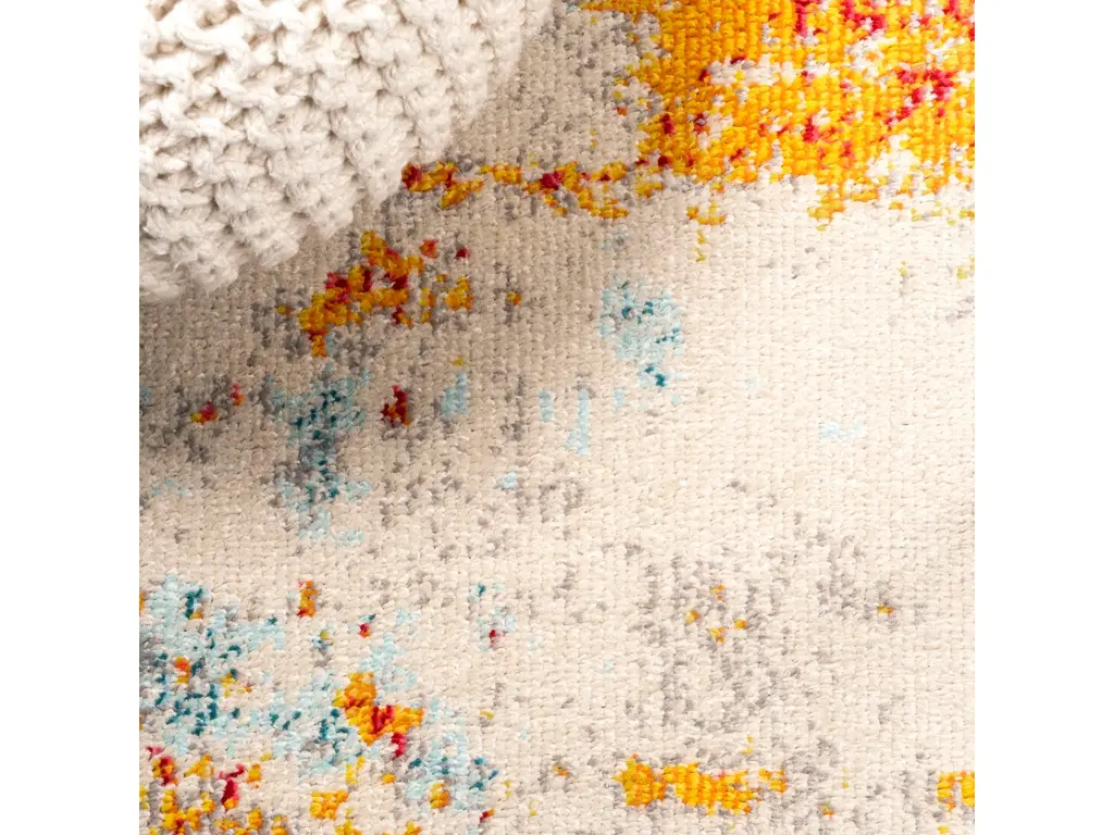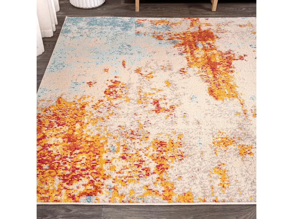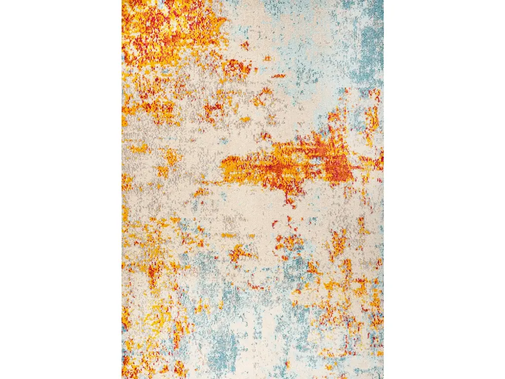 Inspired by the colors of an ocean sunset, this bold rug is modern art for your floor. Oranges, reds and accents of gold splash and mingle in a random abstract design. This unique rug's overall pattern makes it perfect for homes with kids and pets. It's the perfect centerpiece for a mid-century modern, contemporary, or beach house.