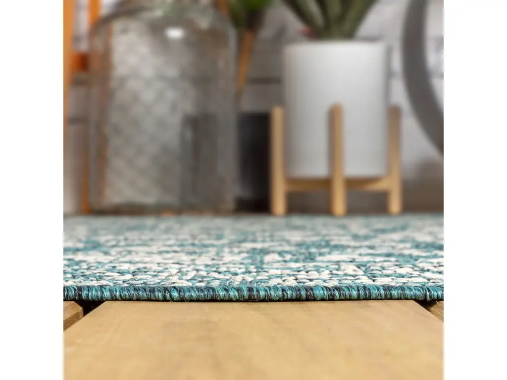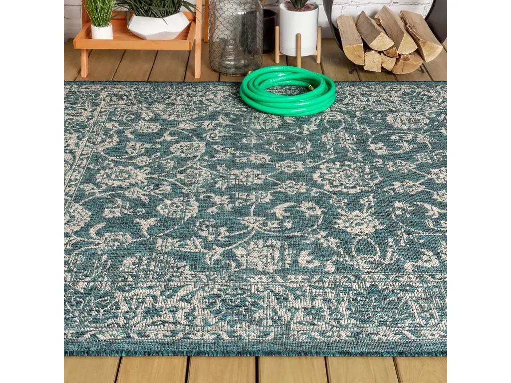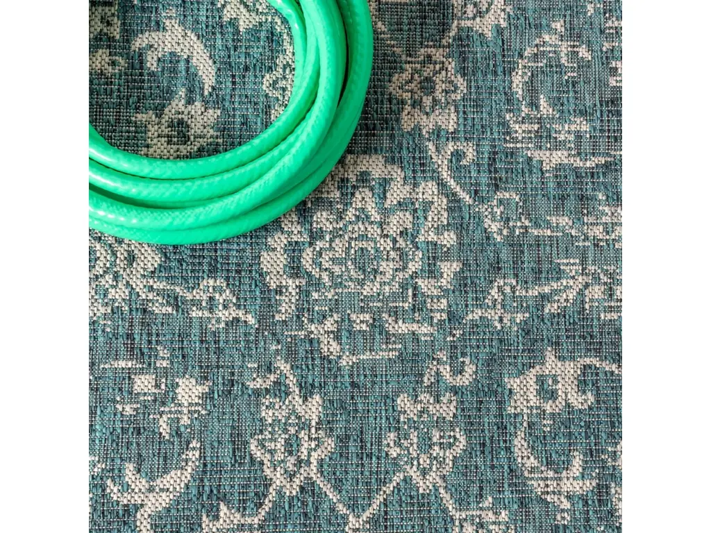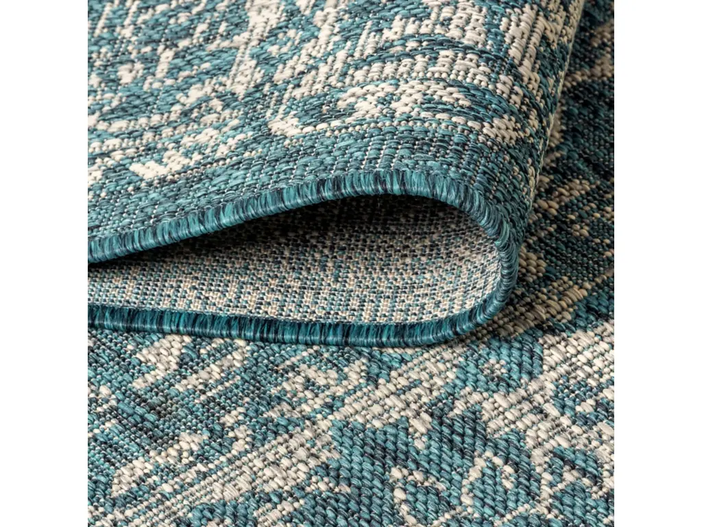 With a vine-and-border design inspired by Persian rugs, our Boho-chic rug adds eclectic style to an outdoor porch or patio. Varied tones of teal and deep blue mingled with a gray pattern give this rug a hand-woven, vintage vibe. The flatweave design is great for high-traffic spaces indoors too.