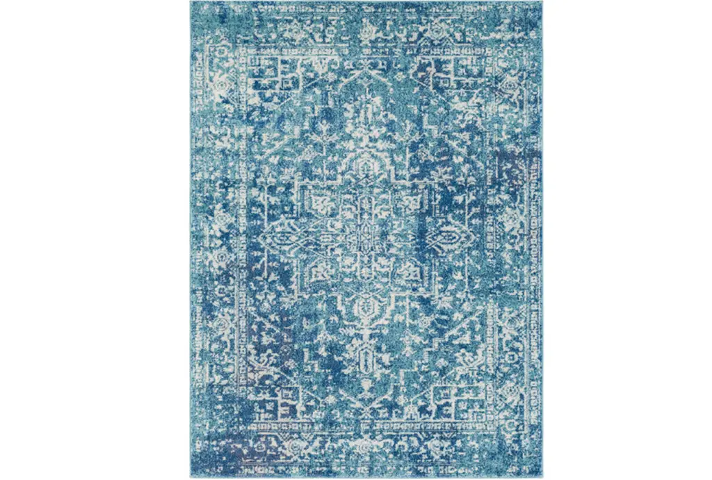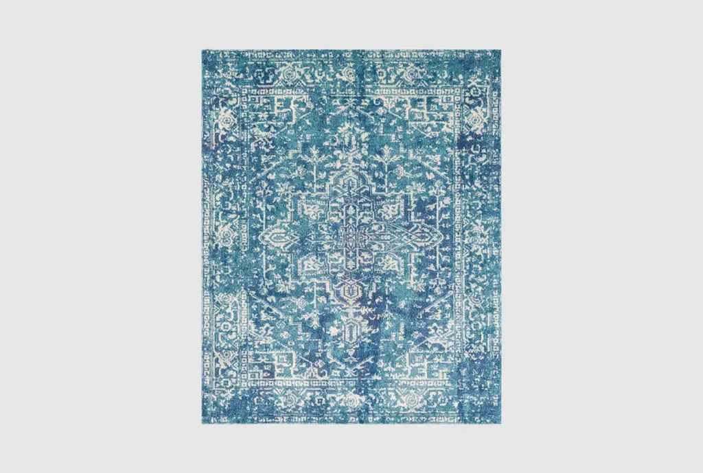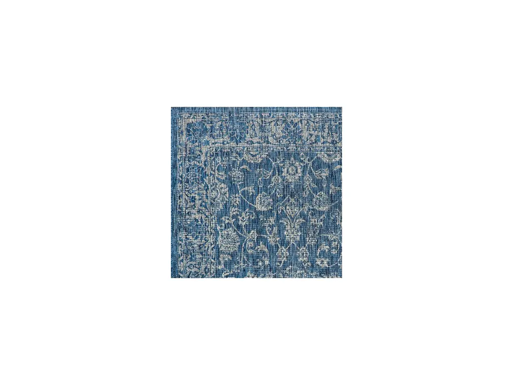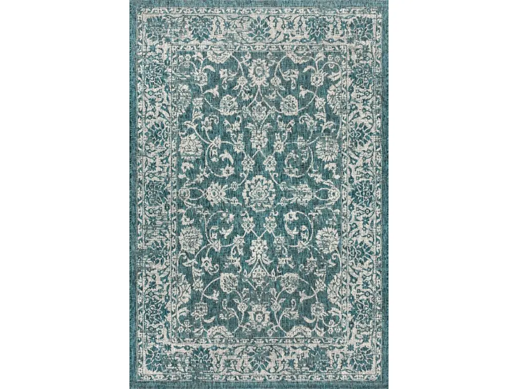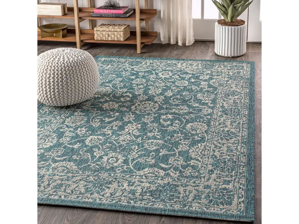 With a vine-and-border design inspired by Persian rugs, our Boho-chic rug adds eclectic style to an outdoor porch or patio. Varied tones of teal and deep blue mingled with a gray pattern give this rug a hand-woven, vintage vibe. The flatweave design is great for high-traffic spaces indoors too.