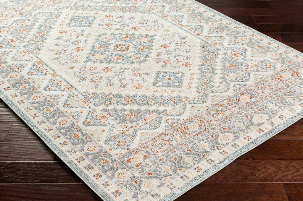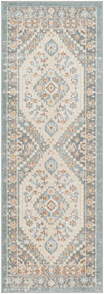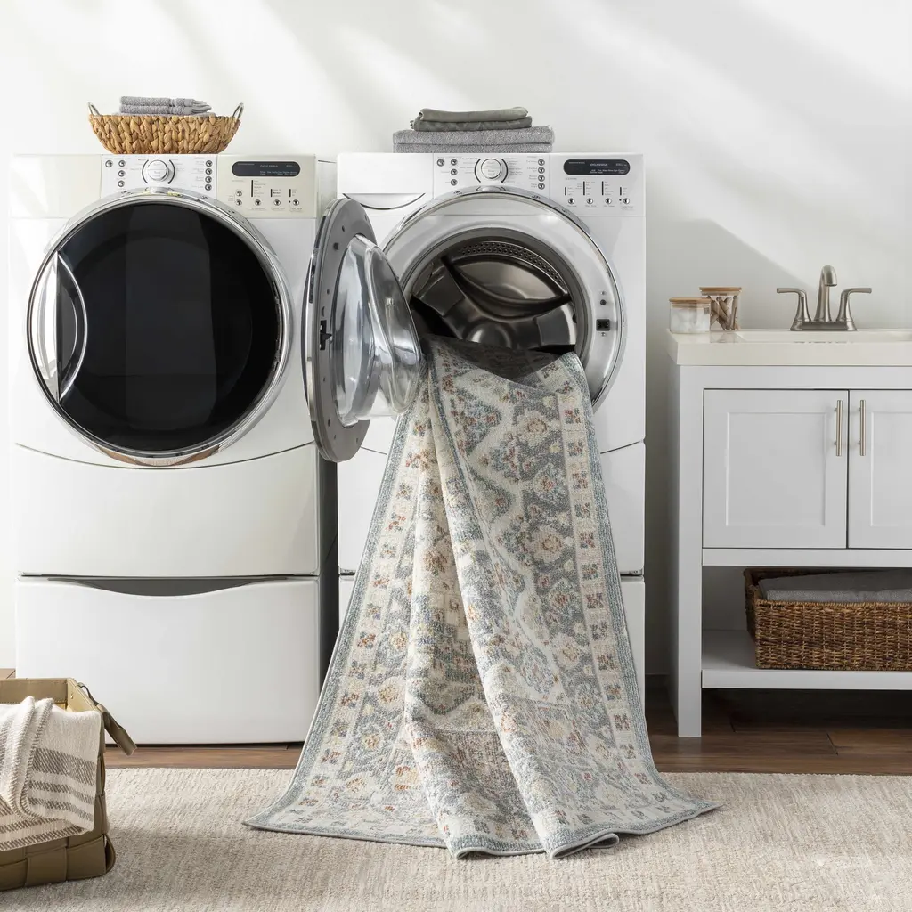 Collection: Jono Colors: Sage, Cream, Gray, Mustard, Peach, Dark Pink Construction: Machine Woven Material: 100% Polyester Pile: Medium Pile Pile Height: 0.31" Styles: Traditional Backing: Rubber Machine Washable: Yes Made In: Turkey Thickness: 0.39" Price Range: $$$$$ (Most Affordable)