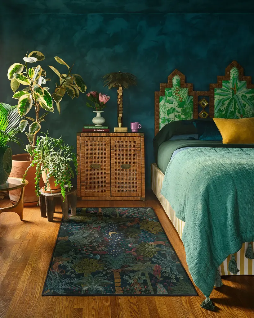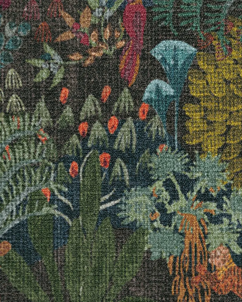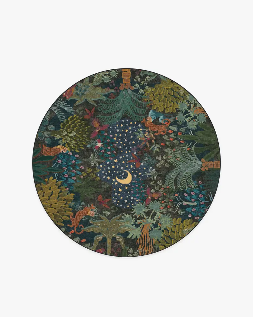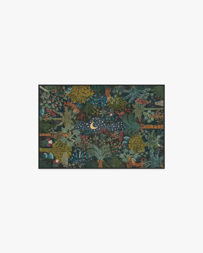 Get ready for a celestial journey with our Justina Blakeney Josephine Midnight Rug. Bring the outside in with jungalicious vibes as you gaze up at the moon through a magical jungle filled with flora and fauna motifs. This lush design features a magnitude of colors, including rich blues, teals, pinks, oranges, and browns, creating a diverse palette that mirrors the enchanting hues of the jungle at night. Water-resistant, stain-resistant, and machine-washable. Rug colors may vary slightly according to your device and the lighting in your space.