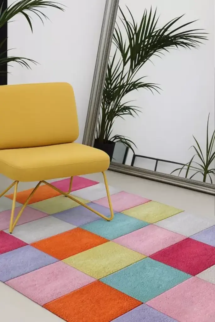 **Made-to-Order. Product will ship within 3 weeks (21–25 business days)** Squares of pink, yellow, green, blue, and orange form a bright checkered grid across this hand-tufted wool rug. The layout is playful but clean, offering a colorful twist on classic geometry. Made from plush New Zealand wool, it adds energy, softness, and structure to living rooms, bedrooms, or any space that could use a bit more color. **Content + Care** \- 100% New Zealand Wool \- Pile Height: 0.75" \- Spot clean only \- Imported **Size + Fit** \- 2' x 3': 24"l x 36"w \- 3' x 5': 36"l x 60"w \- 4' x 6': 48"l x 72"w \- 5' x 7': 60"l x 84"w \- 6' x 9': 72"l x 108"w \- 8' x 10': 96"l x 120"w \- 9' x 12': 108"l x 144"w