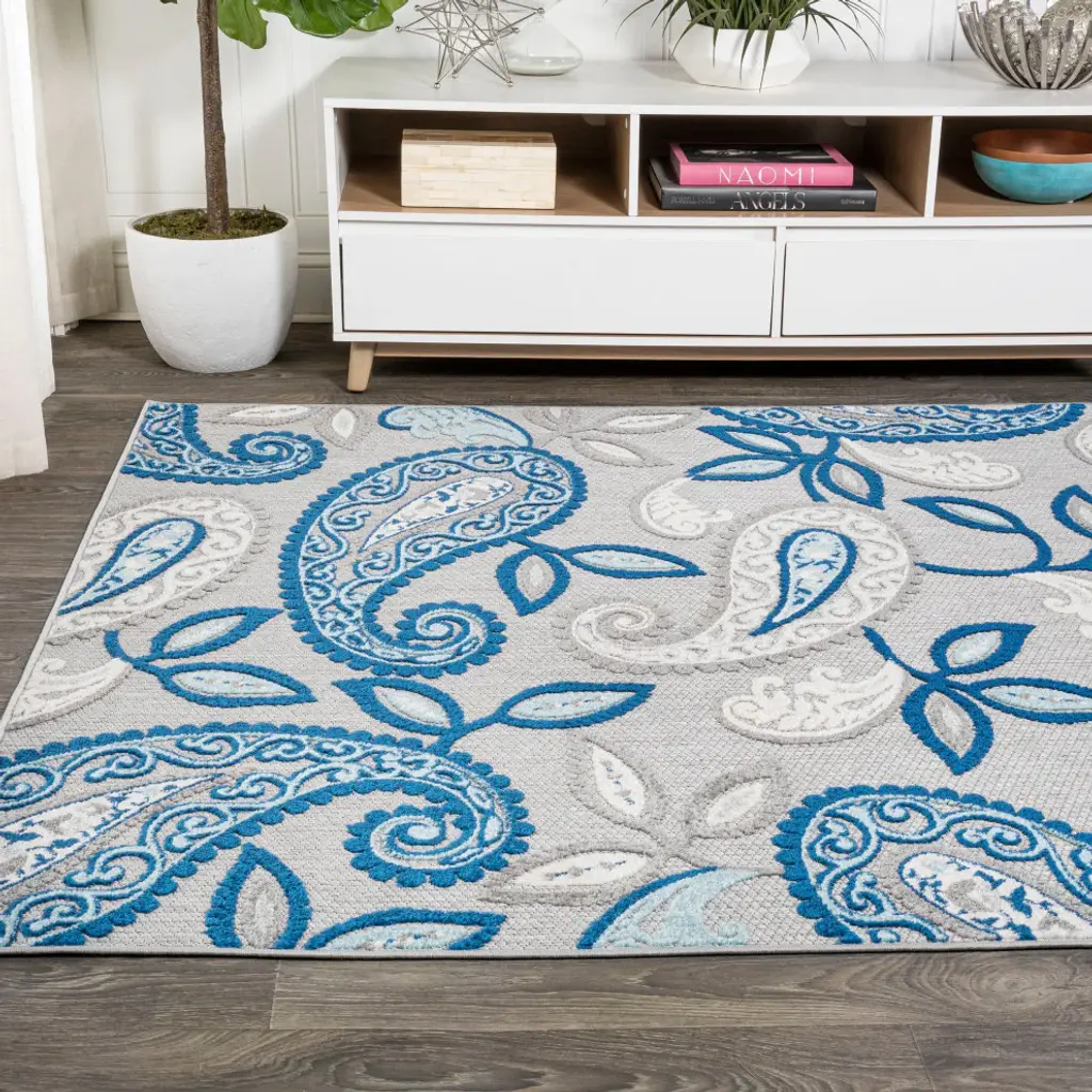 A Boho-inspired paisley pattern gives this indoor-outdoor rug a fresh look that''s ideal for a living room, family room, dining room, bedroom, or kids'' rooms. Soft, durable synthetic fibers are an easy maintenance solution for homes with kids and pets. Choose from several colorways and add a splash of style to your porch or patio. Features:• Power loomed with a high and low 0. 2" pile that''s soft and durable• Woven with gray, blue and cream on a light gray ground• Made from easy-care polypropylene - just sweep, vacuum or hose down with mild soap and water• 100% Polypropylene• No backing, use of rug pad is recommended (sold separately)• Power Loomed in Turkey• Actual Dimension: 5 ft. 3 in. x 7 ft. 7 in. • Color: Blue/Light Gray• Thickness measures: 0. 2 in. • Available in multiple sizes and/or colorsRug Care:• Vacuum regularly and spot clean as needed; avoid direct and continuous exposure to sunlight; use brushless vacuum; remove spills immediately; if liquid, blot with clean, undyed cloth by pressing firmly around the spill to absorb as much as possible; for hard to remove stains, professional rug cleaning is recommended; store in a dry, well ventilated area and rotate for consistent wear• Packing and shipping may cause temporary creases in rugs, which will flatten out after a week on the floor; to expedite the process, try back-rolling your rug before laying it down, and then allow ample time for the remaining creases to relax• Please Note: Due to differences in monitors, some rug colors may vary slightly. Lengths and widths may vary from the published dimensions. Patterns may vary slightly according to shape and size selected. About us:Style your floors with JONATHAN Y. By combining fine craftsmanship and design, this New York creative studio is bringing fashion to your floors. The collection mixes sustainable organic materials, vibrant colors and trend worthy styles to create JONATHAN Y''s distinctive catalog of rugs.