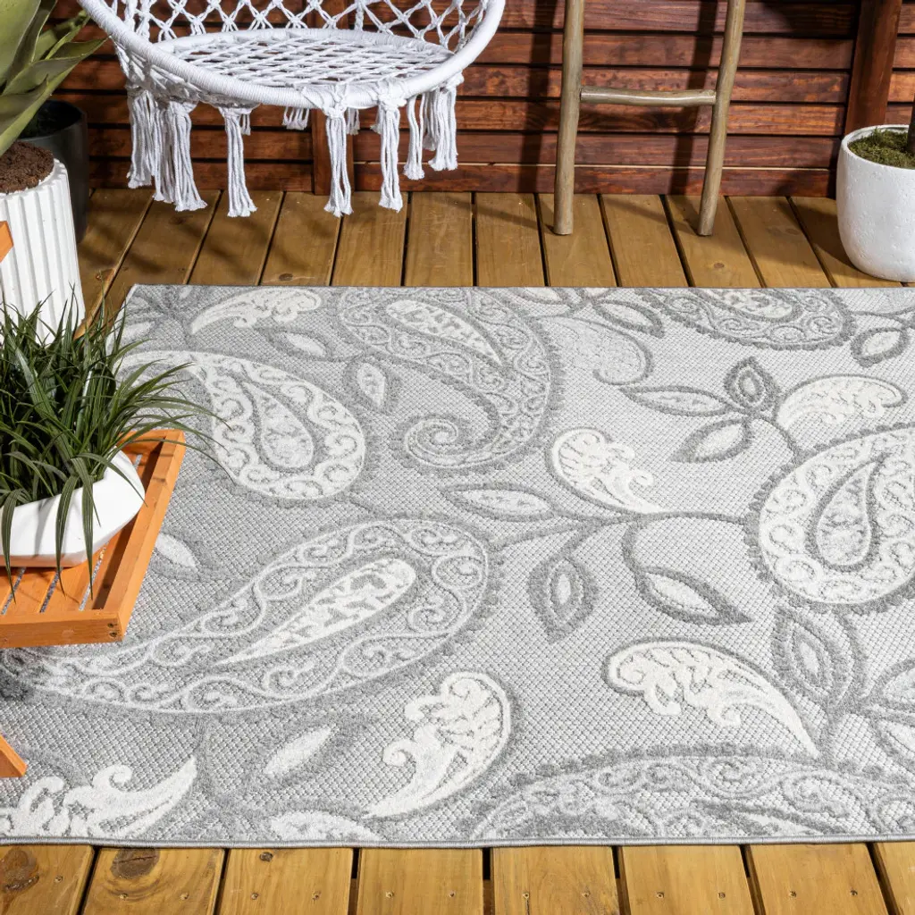 A Boho-inspired paisley pattern gives this indoor-outdoor rug a fresh look that''s ideal for a living room, family room, dining room, bedroom, or kids'' rooms. Soft, durable synthetic fibers are an easy maintenance solution for homes with kids and pets. Choose from several colorways and add a splash of style to your porch or patio. Features:• Power loomed with a high and low 0. 2" pile that''s soft and durable• Woven in shades of gray and ivory on a light gray ground• Made from easy-care polypropylene - just sweep, vacuum or hose down with mild soap and water• 100% Polypropylene• No backing, use of rug pad is recommended (sold separately)• Power Loomed in Turkey• Actual Dimension: 5 ft. 3 in. x 7 ft. 7 in. • Color: Light Gray/Ivory• Thickness measures: 0. 2 in. • Available in multiple sizes and/or colorsRug Care:• Vacuum regularly and spot clean as needed; avoid direct and continuous exposure to sunlight; use brushless vacuum; remove spills immediately; if liquid, blot with clean, undyed cloth by pressing firmly around the spill to absorb as much as possible; for hard to remove stains, professional rug cleaning is recommended; store in a dry, well ventilated area and rotate for consistent wear• Packing and shipping may cause temporary creases in rugs, which will flatten out after a week on the floor; to expedite the process, try back-rolling your rug before laying it down, and then allow ample time for the remaining creases to relax• Please Note: Due to differences in monitors, some rug colors may vary slightly. Lengths and widths may vary from the published dimensions. Patterns may vary slightly according to shape and size selected. About us:Style your floors with JONATHAN Y. By combining fine craftsmanship and design, this New York creative studio is bringing fashion to your floors. The collection mixes sustainable organic materials, vibrant colors and trend worthy styles to create JONATHAN Y''s distinctive catalog of rugs.