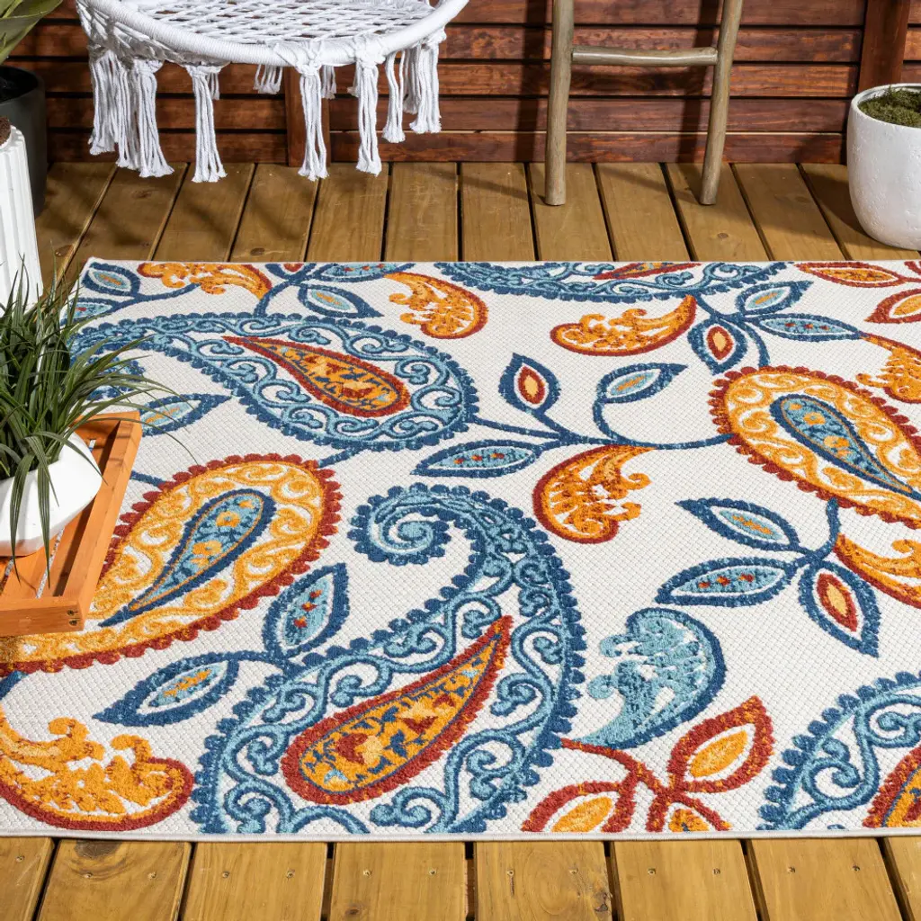 A Boho-inspired paisley pattern gives this indoor-outdoor rug a fresh look that''s ideal for a living room, family room, dining room, bedroom, or kids'' rooms. Soft, durable synthetic fibers are an easy maintenance solution for homes with kids and pets. Choose from several colorways and add a splash of style to your porch or patio. Features:• Power loomed with a high and low 0. 2" pile that''s soft and durable• Woven with coral, blue-green and yellow on a gray ground• Made from easy-care polypropylene - just sweep, vacuum or hose down with mild soap and water• 100% Polypropylene• No backing, use of rug pad is recommended (sold separately)• Power Loomed in Turkey• Actual Dimension: 3 ft. x 5 ft. • Color: Orange/Blue• Thickness measures: 0. 2 in. • Available in multiple sizes and/or colorsRug Care:• Vacuum regularly and spot clean as needed; avoid direct and continuous exposure to sunlight; use brushless vacuum; remove spills immediately; if liquid, blot with clean, undyed cloth by pressing firmly around the spill to absorb as much as possible; for hard to remove stains, professional rug cleaning is recommended; store in a dry, well ventilated area and rotate for consistent wear• Packing and shipping may cause temporary creases in rugs, which will flatten out after a week on the floor; to expedite the process, try back-rolling your rug before laying it down, and then allow ample time for the remaining creases to relax• Please Note: Due to differences in monitors, some rug colors may vary slightly. Lengths and widths may vary from the published dimensions. Patterns may vary slightly according to shape and size selected. About us:Style your floors with JONATHAN Y. By combining fine craftsmanship and design, this New York creative studio is bringing fashion to your floors. The collection mixes sustainable organic materials, vibrant colors and trend worthy styles to create JONATHAN Y''s distinctive catalog of rugs.