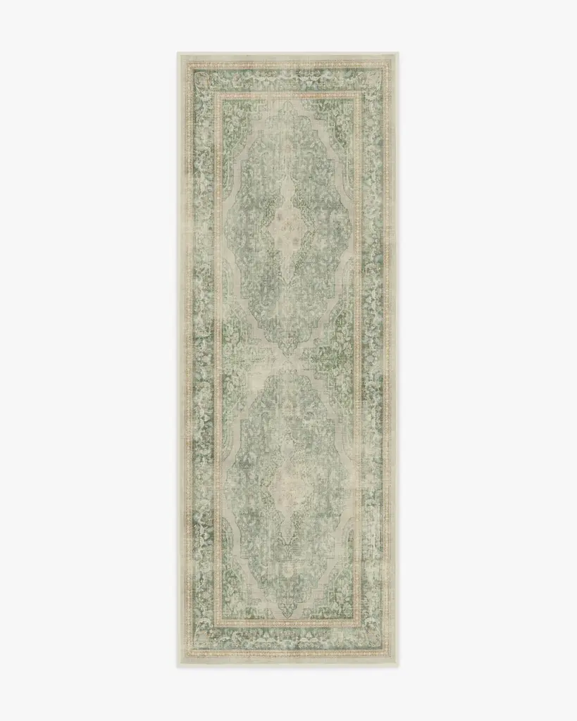 Romanticize the everyday with our Regency-era Juliet Sage Green Rug. This two-tone, distressed, floral-bordered design gracefully frames a subtle trellis field pattern. The soft sage green background is delicately adorned with cream flower motifs. Water-resistant, stain-resistant, and machine-washable. Rug colors may vary slightly according to your device and the lighting in your space.