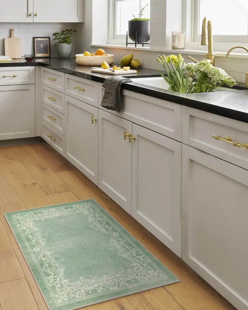 Romanticize the everyday with our Regency-era Juliet Sage Green Rug. This two-tone, distressed, floral-bordered design gracefully frames a subtle trellis field pattern. The soft sage green background is delicately adorned with cream flower motifs. Water-resistant, stain-resistant, and machine-washable. Rug colors may vary slightly according to your device and the lighting in your space.