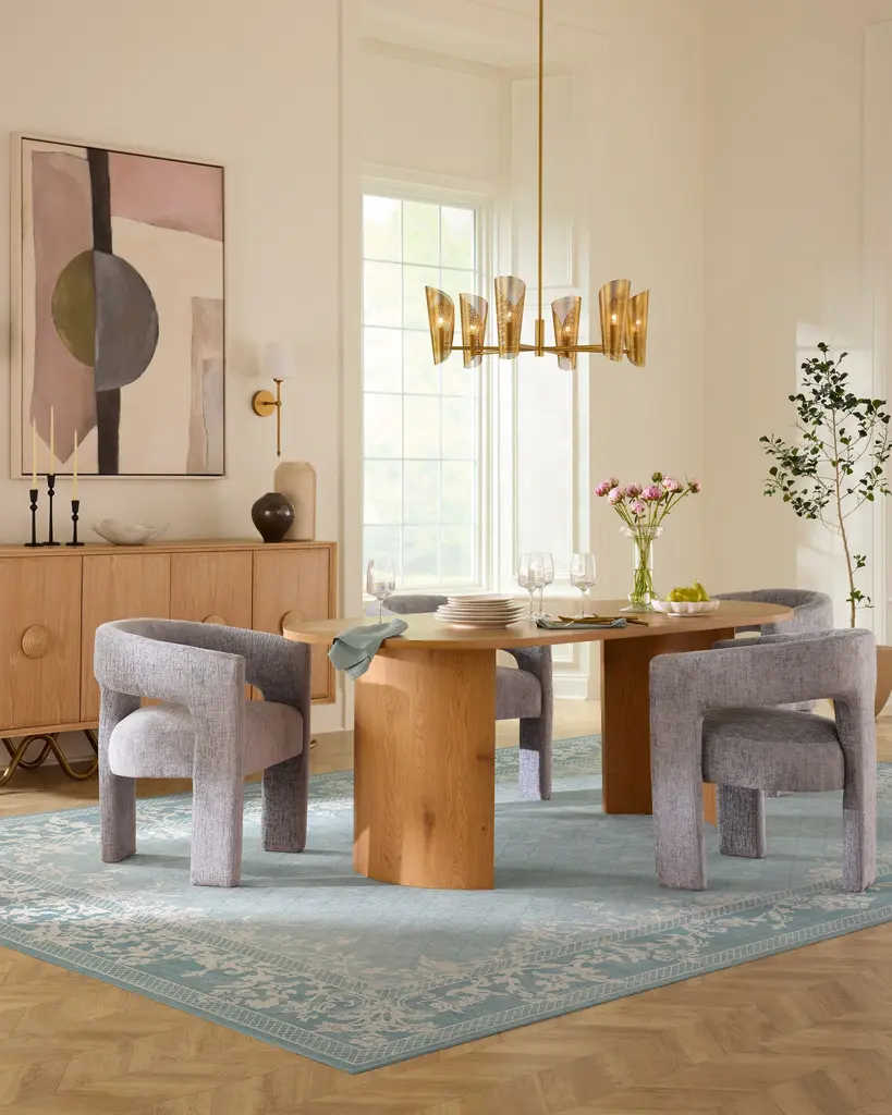 Romanticize the everyday with our Regency-era Juliet Slate Blue Rug. A two-tone, floral border gracefully frames a subtle trellis field pattern against a soft, light blue-grey background. Water-resistant, stain-resistant, and machine-washable. Rug colors may vary slightly according to your device and the lighting in your space.