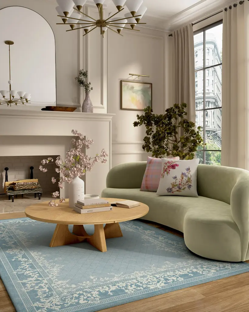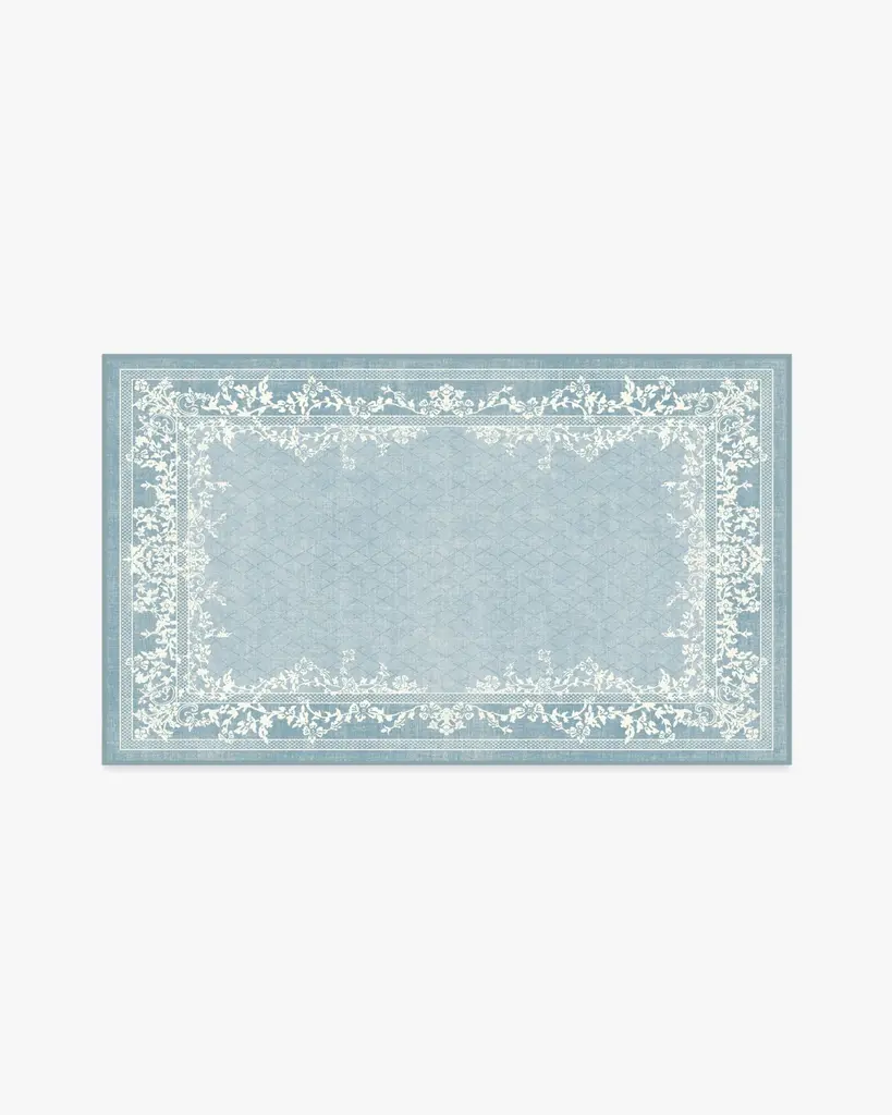 Romanticize the everyday with our Regency-era Juliet Slate Blue Rug. A two-tone, floral border gracefully frames a subtle trellis field pattern against a soft, light blue-grey background. Water-resistant, stain-resistant, and machine-washable. Rug colors may vary slightly according to your device and the lighting in your space.