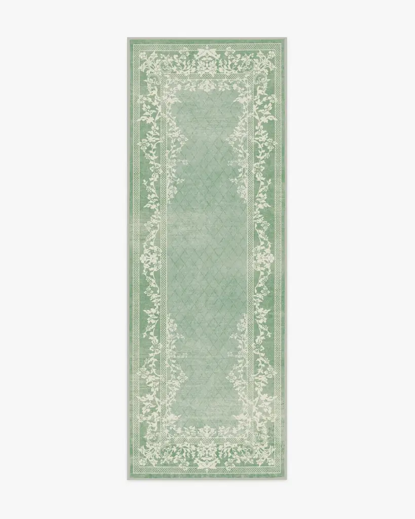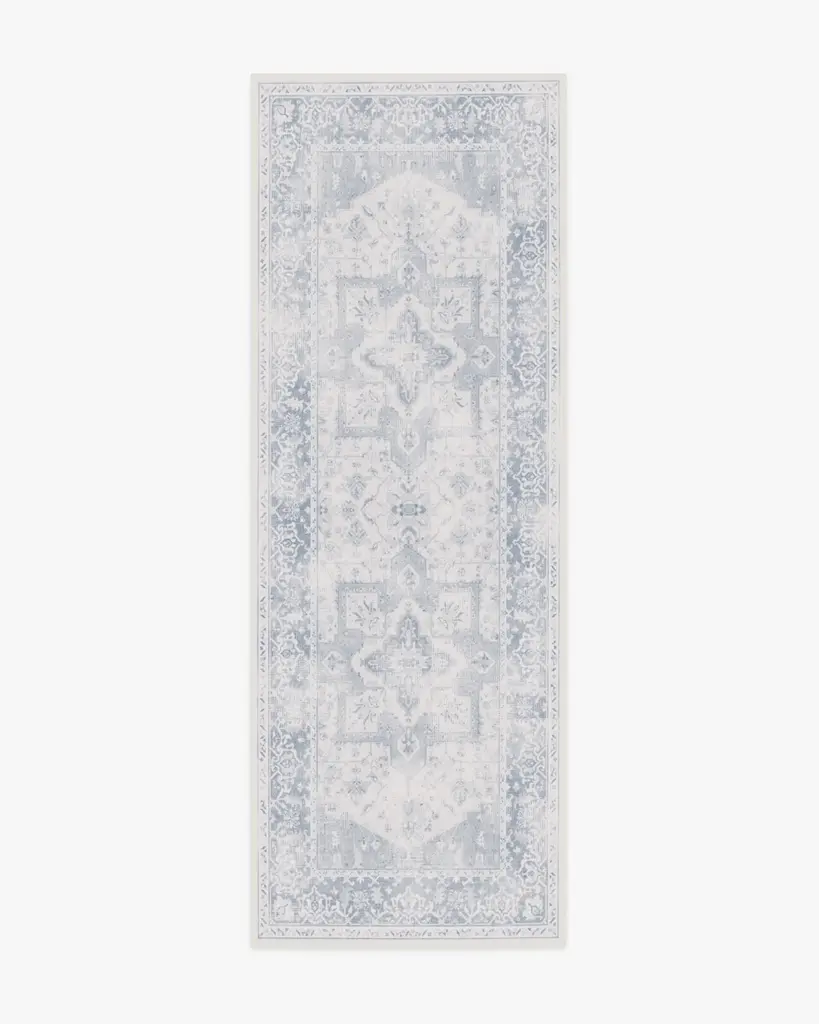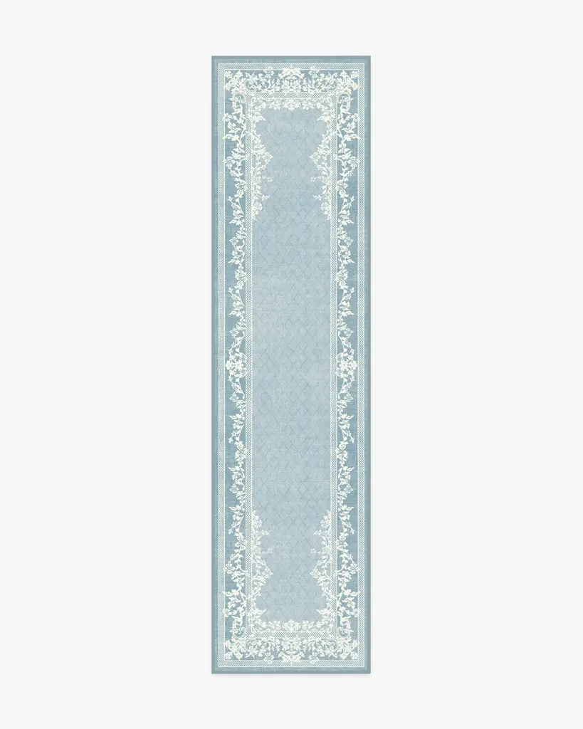 Romanticize the everyday with our Regency-era Juliet Slate Blue Rug. A two-tone, floral border gracefully frames a subtle trellis field pattern against a soft, light blue-grey background. Water-resistant, stain-resistant, and machine-washable. Rug colors may vary slightly according to your device and the lighting in your space.