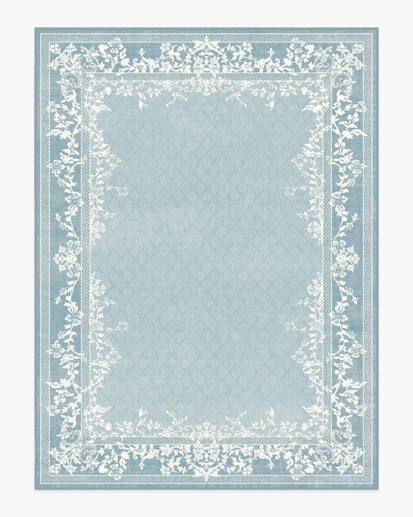 Romanticize the everyday with our Regency-era Juliet Slate Blue Rug. A two-tone, floral border gracefully frames a subtle trellis field pattern against a soft, light blue-grey background. Water-resistant, stain-resistant, and machine-washable. Rug colors may vary slightly according to your device and the lighting in your space.