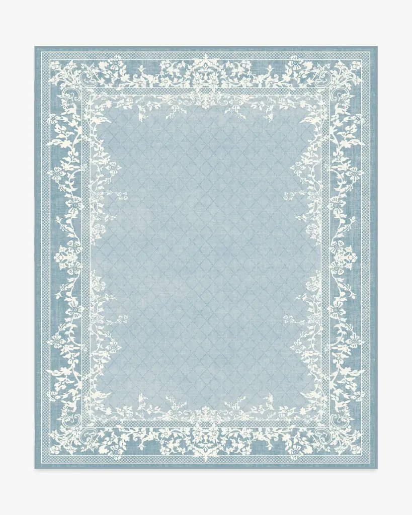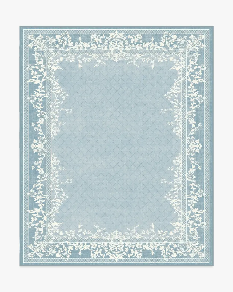 Romanticize the everyday with our Regency-era Juliet Slate Blue Rug. A two-tone, floral border gracefully frames a subtle trellis field pattern against a soft, light blue-grey background. Water-resistant, stain-resistant, and machine-washable. Rug colors may vary slightly according to your device and the lighting in your space.