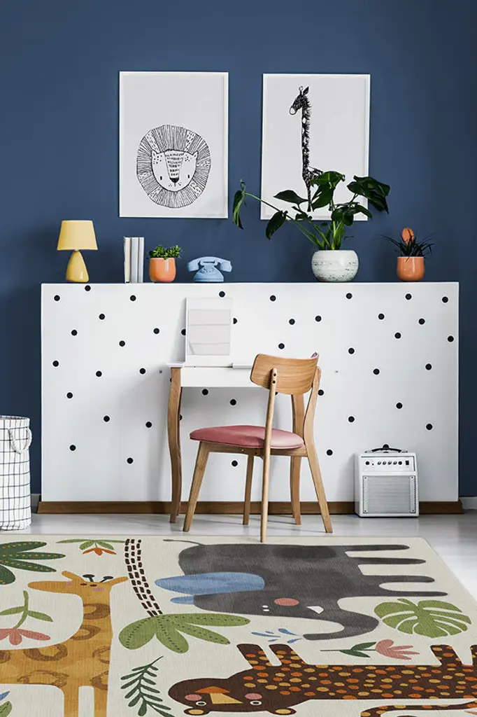 Little explorers will love this crew of critters on our Jungle Safari Multicolor Rug. Tinted in watercolor hues of blue, green, and yellow, this rug features cheerful animals - lion, zebra, giraffe, elephant, and crocodile - roaming among rubber trees, leaves, and flowers, adding a wildly whimsical touch to any child's space.
