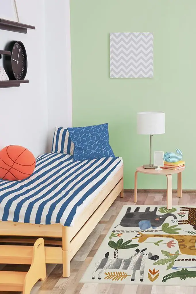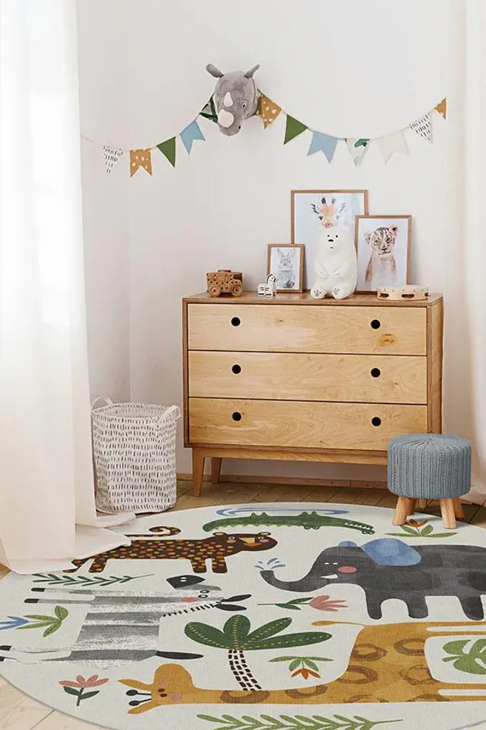 Little explorers will love this crew of critters on our Jungle Safari Multicolor Rug. Tinted in watercolor hues of blue, green, and yellow, this rug features cheerful animals - lion, zebra, giraffe, elephant, and crocodile - roaming among rubber trees, leaves, and flowers, adding a wildly whimsical touch to any child's space.