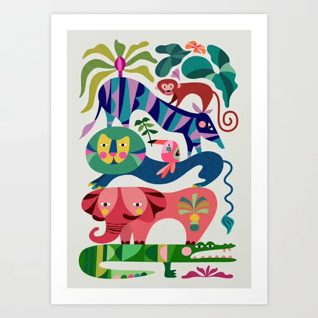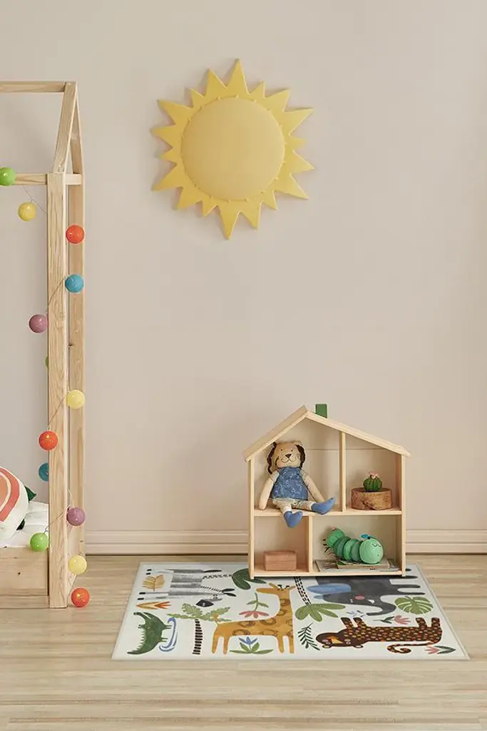 Little explorers will love this crew of critters on our Jungle Safari Multicolor Rug. Tinted in watercolor hues of blue, green, and yellow, this rug features cheerful animals - lion, zebra, giraffe, elephant, and crocodile - roaming among rubber trees, leaves, and flowers, adding a wildly whimsical touch to any child's space.