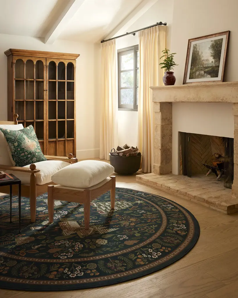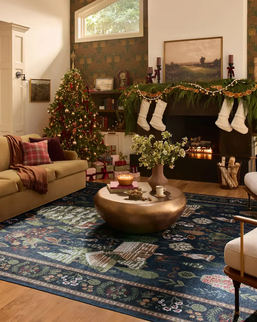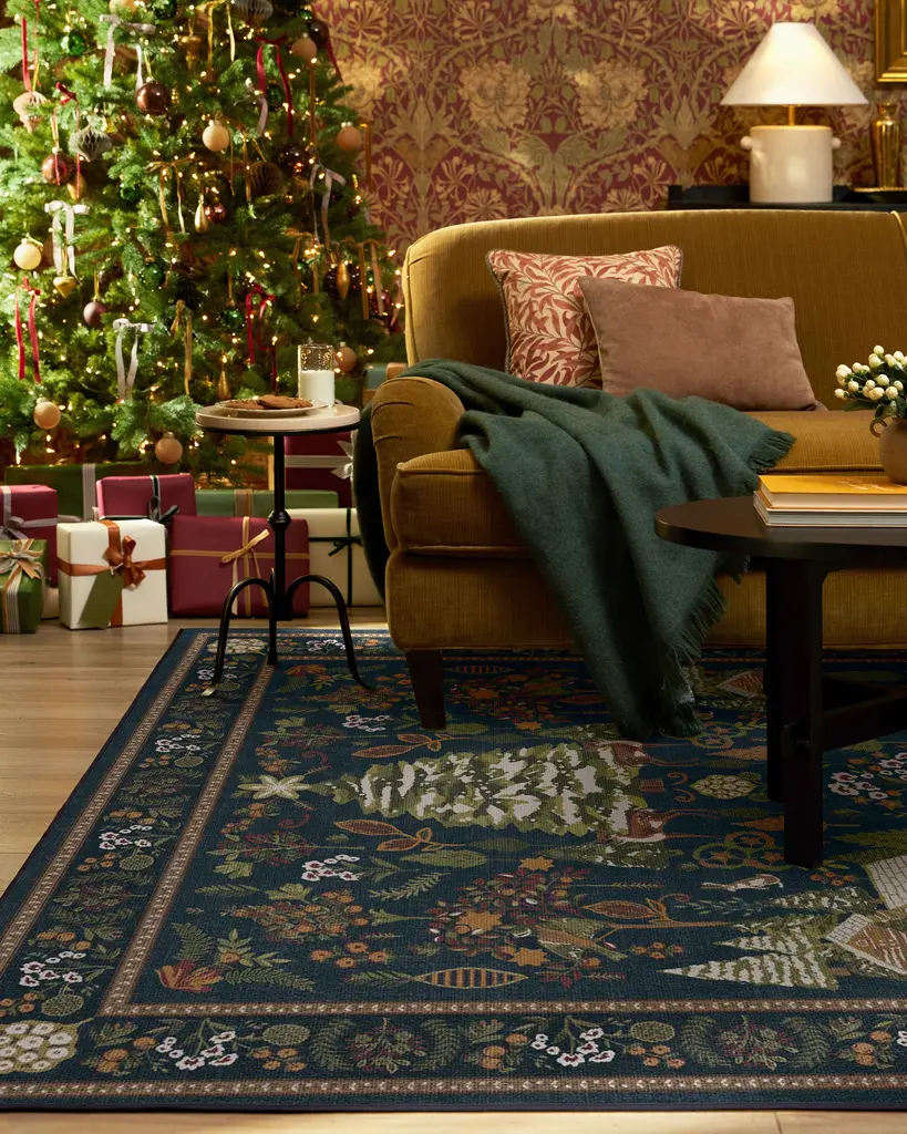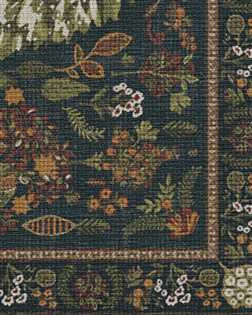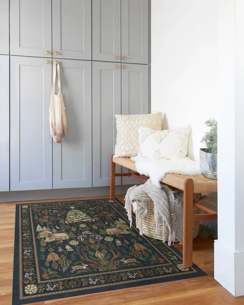 Merrily frolic through a winter wonderland with our Juniper Midnight Blue Rug. This cottagecore design features pine trees, winter animals, log cabins, and pretty foliage throughout. The deep blue background sets the tone for sage, light greens, warm neutrals, and lush red motifs, highlighted with pops of light cream. Water-resistant, stain-resistant, and machine-washable. Rug colors may vary slightly according to your device and the lighting in your space.
