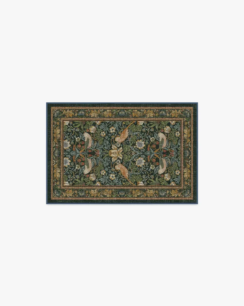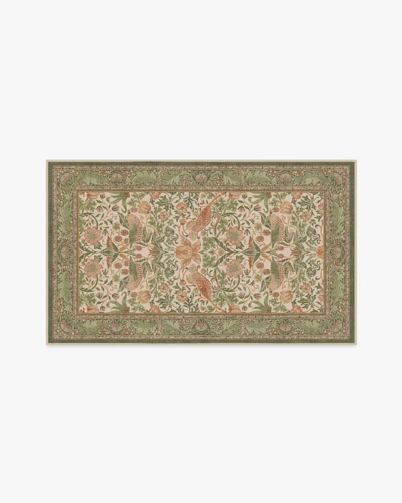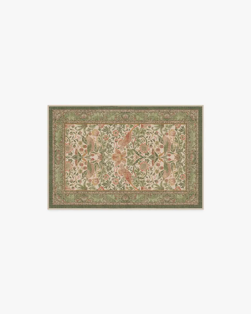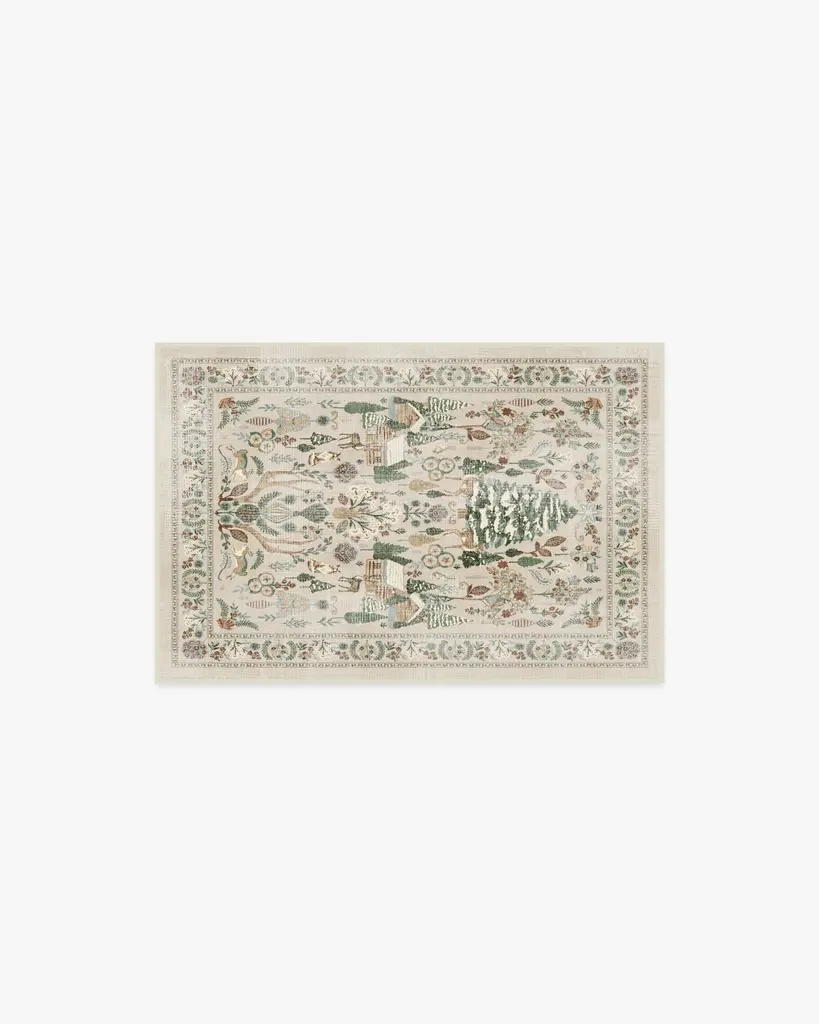 Step into a whimsical wonderland with our Juniper Neutral Multicolor Rug. This cottagecore-inspired tapestry design features pine trees, winter animals, log cabins, and pretty foliage. The warm neutral background is adorned with soft, vintage greens and reds, accented by pops of cream and gold. Water-resistant, stain-resistant, and machine-washable. Rug colors may vary slightly according to your device and the lighting in your space.