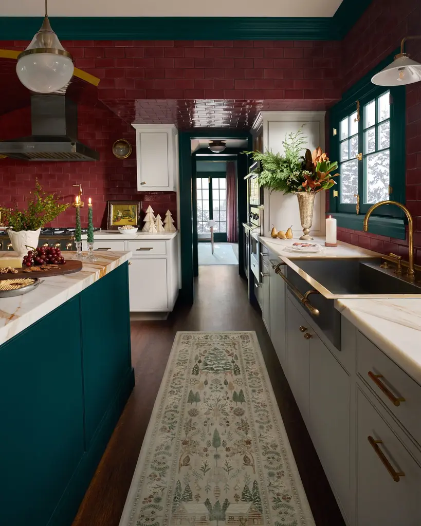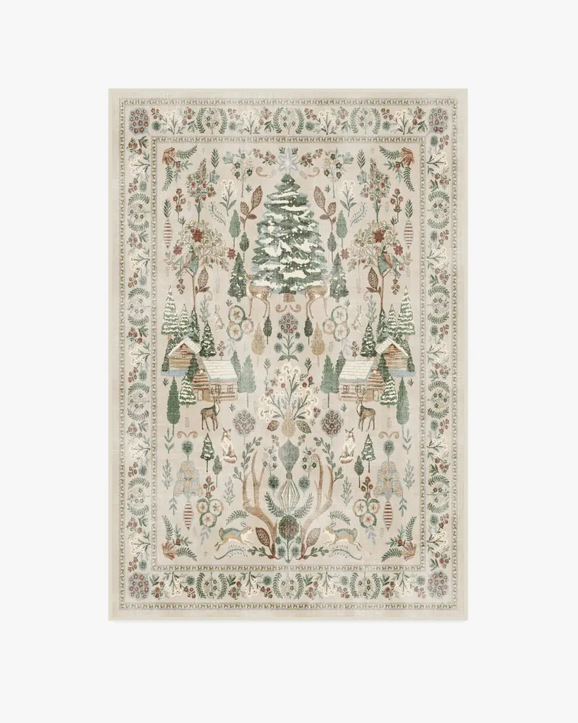 Step into a whimsical wonderland with our Juniper Neutral Multicolor Rug. This cottagecore-inspired tapestry design features pine trees, winter animals, log cabins, and pretty foliage. The warm neutral background is adorned with soft, vintage greens and reds, accented by pops of cream and gold. Water-resistant, stain-resistant, and machine-washable. Rug colors may vary slightly according to your device and the lighting in your space.