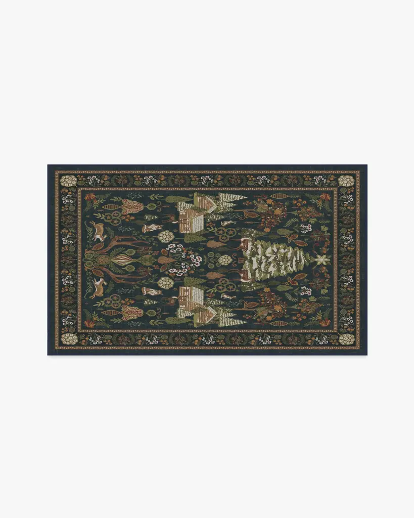 Step into a whimsical wonderland with our Juniper Neutral Multicolor Rug. This cottagecore-inspired tapestry design features pine trees, winter animals, log cabins, and pretty foliage. The warm neutral background is adorned with soft, vintage greens and reds, accented by pops of cream and gold. Water-resistant, stain-resistant, and machine-washable. Rug colors may vary slightly according to your device and the lighting in your space.