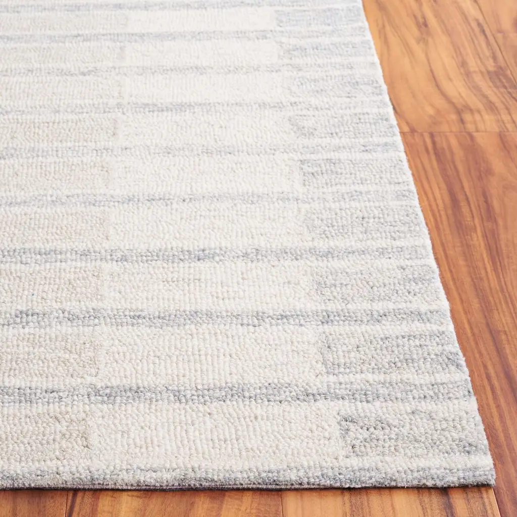 Introduce elegance and warmth into your space with this beautifully hand-tufted area rug. Measuring at a versatile 3 feet by 5 feet, this small rectangular piece is perfect for adding a touch of contemporary style to any room. Crafted with a blend of soft wool and durable cotton, this rug's striped pattern in soothing beige and grey tones complements various decor themes. Originating from India, this rug showcases skilled craftsmanship. Its 1/2 inch height offers a comfortable surface underfoot, making it a delightful addition to living rooms, bedrooms, or cozy reading nooks. The hand-tufted weave technique not only enhances its texture but also adds a unique character to your home. Elevate your interior with this stunning piece that blends functionality with style. Whether placed under a coffee table or at the foot of your bed, it promises to be a charming focal point that enhances any setting.