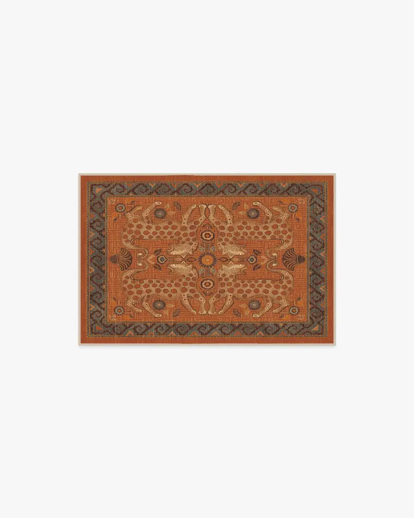 Sea meets sand with our Justina Blakeney Eartha Terracotta Rug. Inspired by the mystique of wild leopards and skillfully illustrated by Justina herself, this lively rug tells a story through its shell and floral motifs that symbolize protection and growth. The color palette pairs warm tones like terracotta and chocolate brown with dusty blues and bright teal to evoke the power of earth and sky. Water-resistant, stain-resistant, and machine-washable. Rug colors may vary slightly according to your device and the lighting in your space.