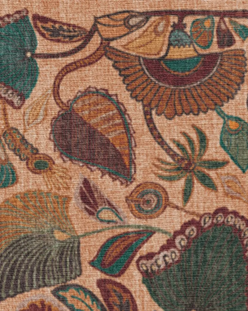 Experience maximum bohemian magic with our Justina Blakeney Georgia Kaleidoscope Rug. An homage to the legendary artist Georgia O'Keeffe and her use of natural forms and flowers, this botanical design features lively plant and petal motifs in a captivating symmetrical pattern. The kaleidoscope of colors includes oranges, terracottas, yellows, lavenders, teals, greens, and browns against a light peach background. Water-resistant, stain-resistant, and machine-washable. Rug colors may vary slightly according to your device and the lighting in your space.
