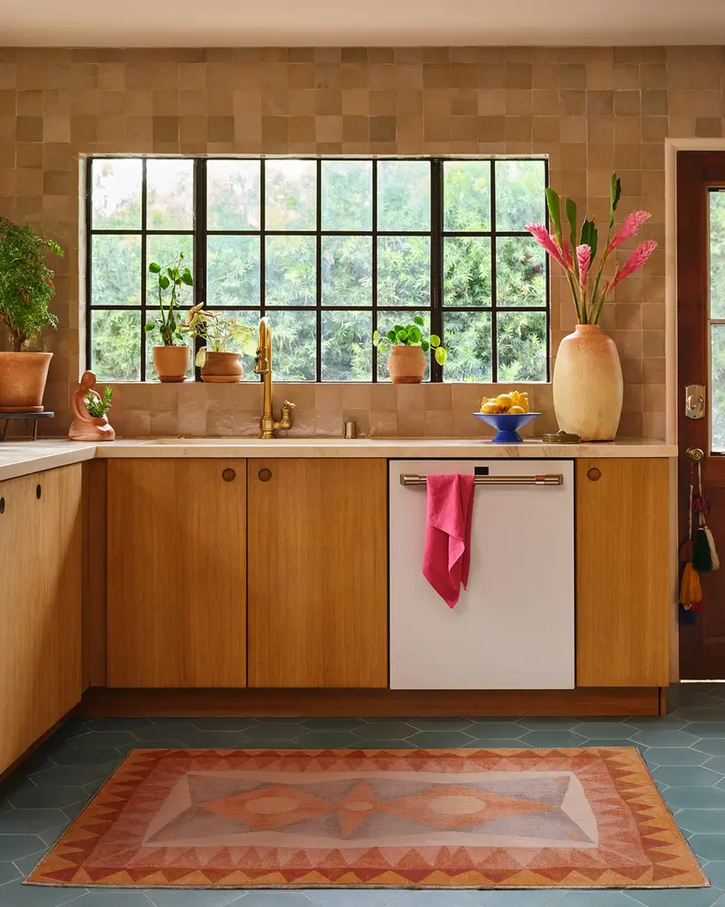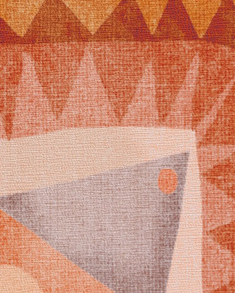 Come home to color and art reminiscent of Hilma af Klint with our Justina Blakeney Hilma Sunset Rug. Inspired by mesmerizing geodes and the enchanting way crystals refract light, this radial triangle design features a geometric play on a sunburst surrounded by soft, luminous edges. Its stunning color palette includes tones of orange, terracotta, pinks, and lavender against an off-white and pink background. Water-resistant, stain-resistant, and machine-washable. Rug colors may vary slightly according to your device and the lighting in your space.