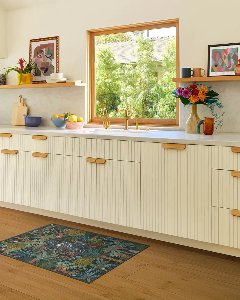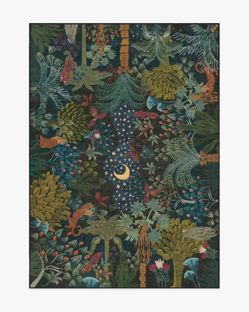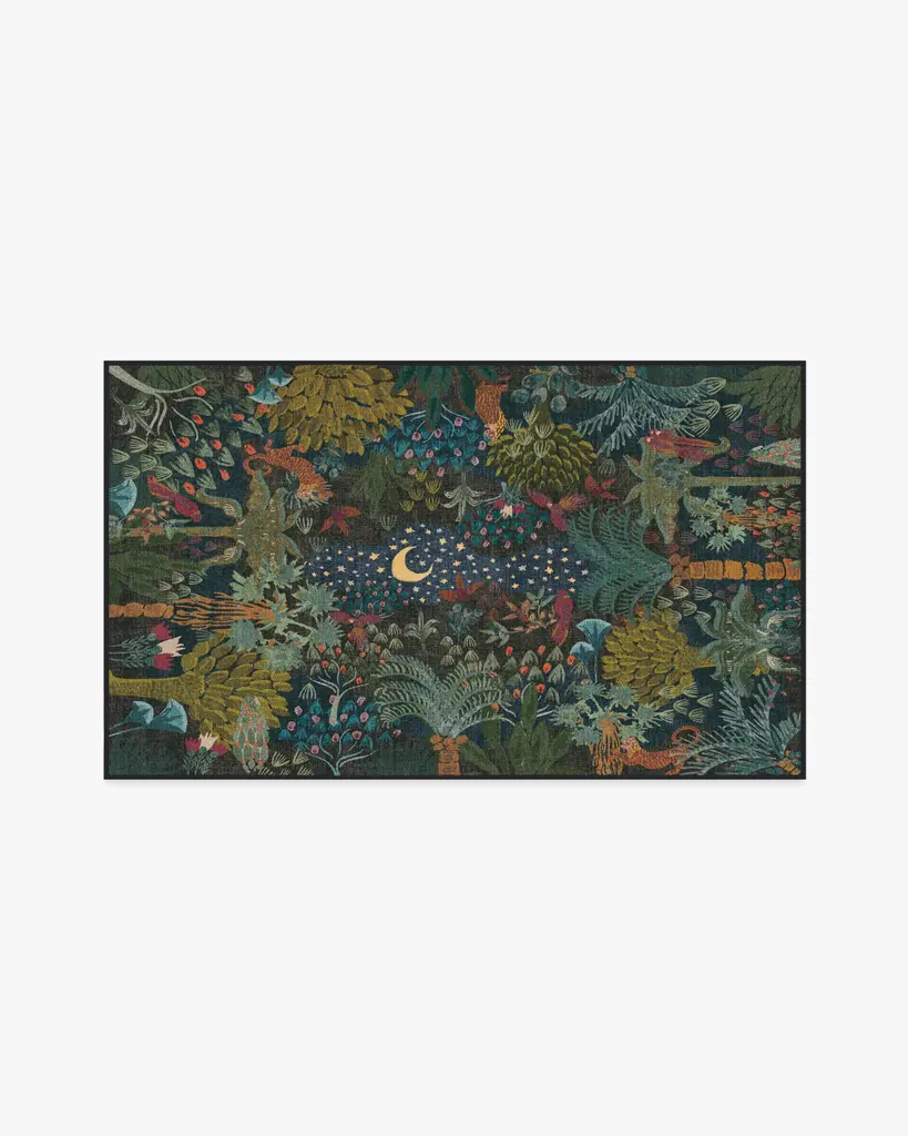 Get ready for a celestial journey with our Justina Blakeney Josephine Midnight Rug. Bring the outside in with jungalicious vibes as you gaze up at the moon through a magical jungle filled with flora and fauna motifs. This lush design features a magnitude of colors, including rich blues, teals, pinks, oranges, and browns, creating a diverse palette that mirrors the enchanting hues of the jungle at night. Water-resistant, stain-resistant, and machine-washable. Rug colors may vary slightly according to your device and the lighting in your space.