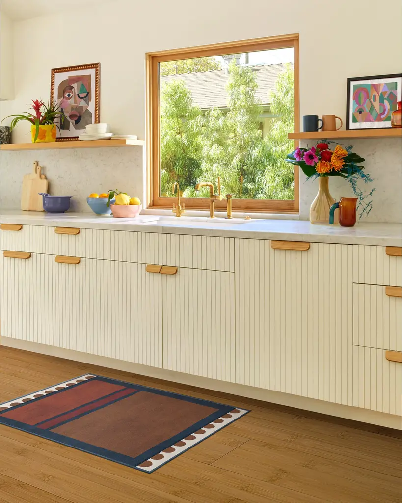 Your home is your canvas with our Justina Blakeney Nina Indigo & Rust Rug. Inspired by the work of abstract expressionist Mark Rothko, this geometric design features scalloped-edge curves and fluid colors, echoing Justina's sense of style. The cream and camel border, along with the navy blue outline, gracefully frames the composition, while rustic orange, red, and camel brown fill in this color-blocked and artistic style. Water-resistant, stain-resistant, and machine-washable. Rug colors may vary slightly according to your device and the lighting in your space.