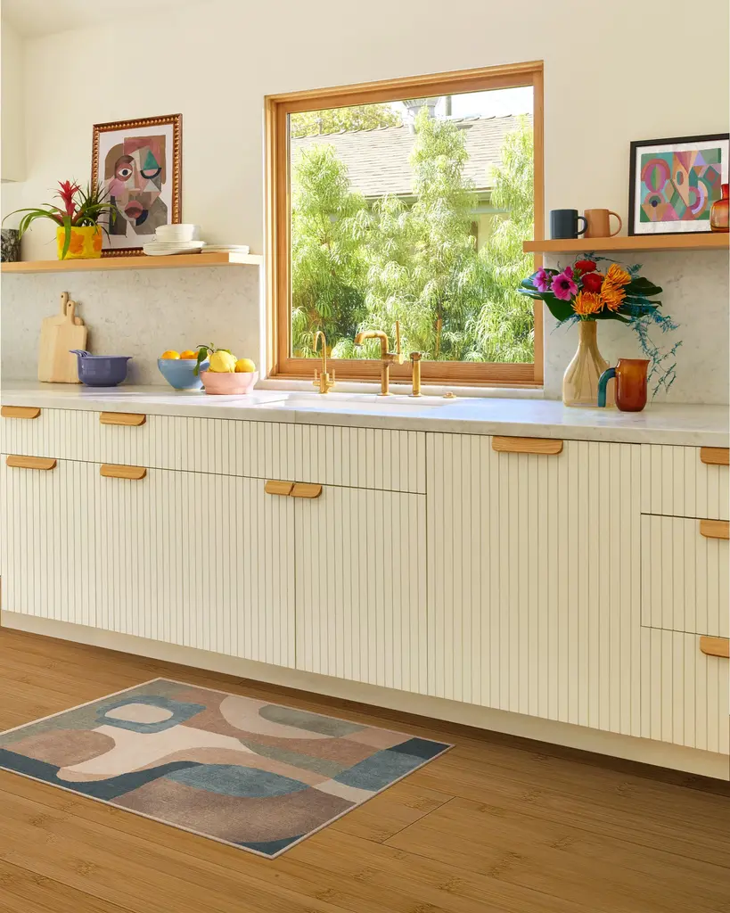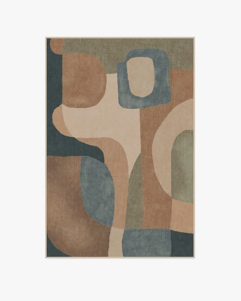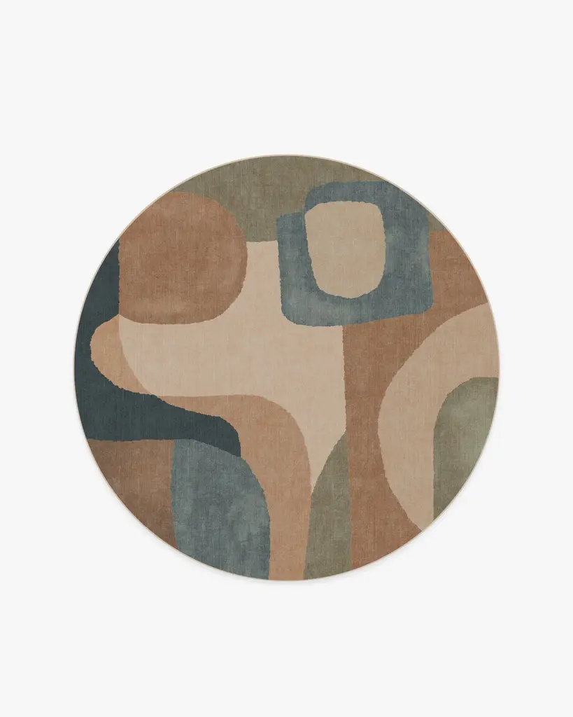 Decorate wild with our Justina Blakeney Sonia Sand & Ocean Rug. Inspired by Justina's original painting, "Tomorrow," this Orphism-like design features Justina's hand-painted geometric shapes playfully intertwined. The color palette seamlessly blends warm neutrals and creams with and cool blues and soft sage greens. Water-resistant, stain-resistant, and machine-washable. Rug colors may vary slightly according to your device and the lighting in your space.