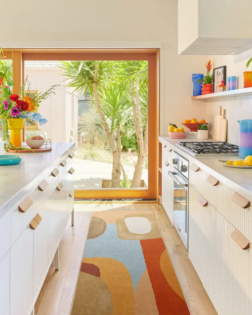 Decorate wild with our Justina Blakeney Sonia Terra & Sage Rug. Inspired by Justina's original painting, "Tomorrow," this Orphism-like design features Justina's hand-painted geometric shapes playfully intertwined. The color palette seamlessly blends terracotta, orange, peach, yellow, sage, chartreuse, cream, and dusty sky blue. Water-resistant, stain-resistant, and machine-washable. Rug colors may vary slightly according to your device and the lighting in your space.