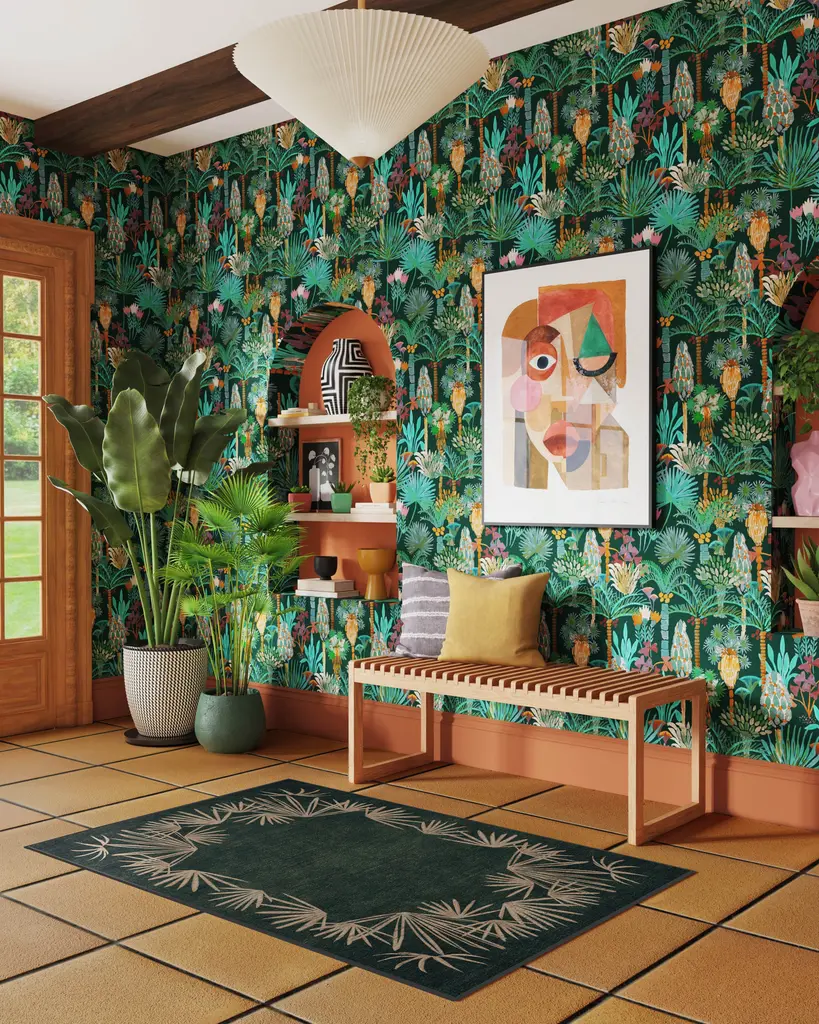 Beautiful. Breezy. Boho. Inspired by the swaying palm trees in Elysian Valley, Justina's former home, our Justina Blakeney Tarsila Forest Rug borrows artistic influence from Brazilian painter Tarsila de Aguiar do Amaral. The rich forest green background is surrounded by natural, warm palm motifs that bring serenity and style to any space. Water-resistant, stain-resistant, and machine-washable. Rug colors may vary slightly according to your device and the lighting in your space.