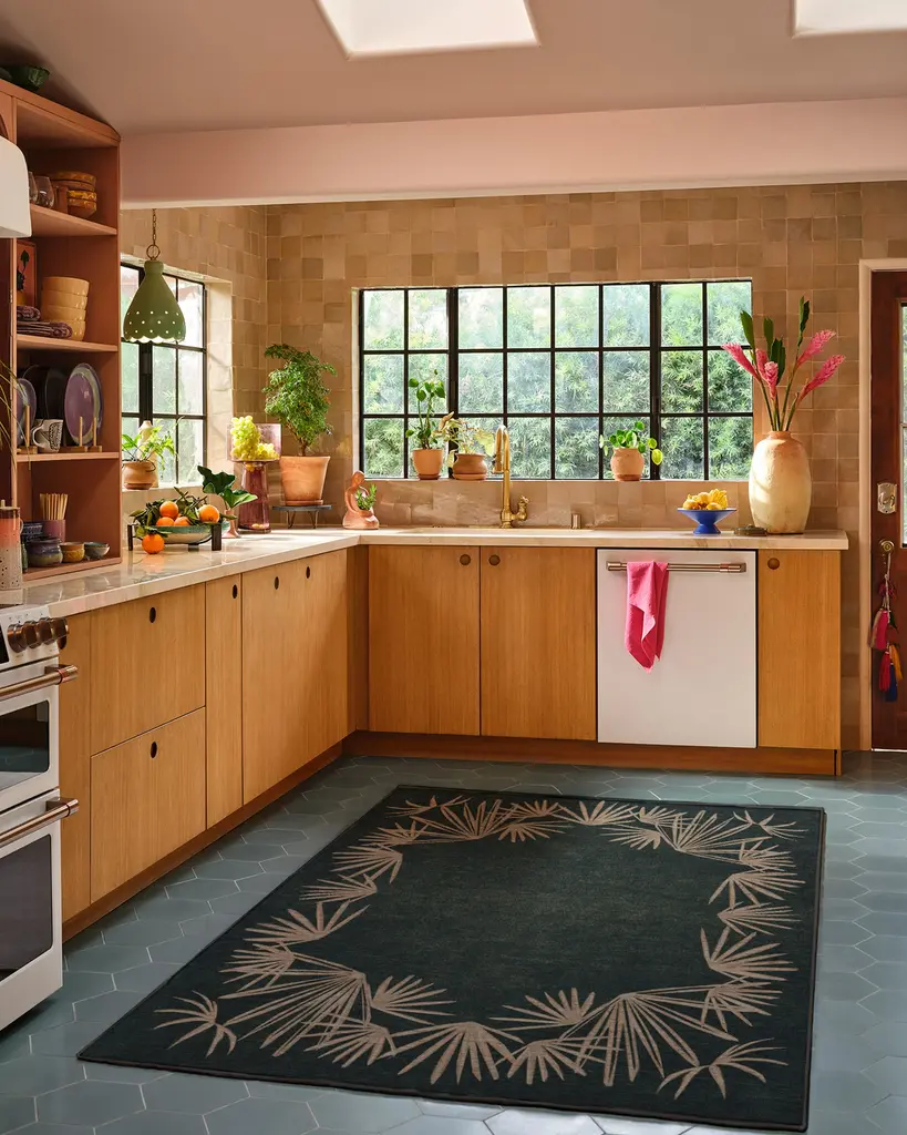 Beautiful. Breezy. Boho. Inspired by the swaying palm trees in Elysian Valley, Justina's former home, our Justina Blakeney Tarsila Forest Rug borrows artistic influence from Brazilian painter Tarsila de Aguiar do Amaral. The rich forest green background is surrounded by natural, warm palm motifs that bring serenity and style to any space. Water-resistant, stain-resistant, and machine-washable. Rug colors may vary slightly according to your device and the lighting in your space.