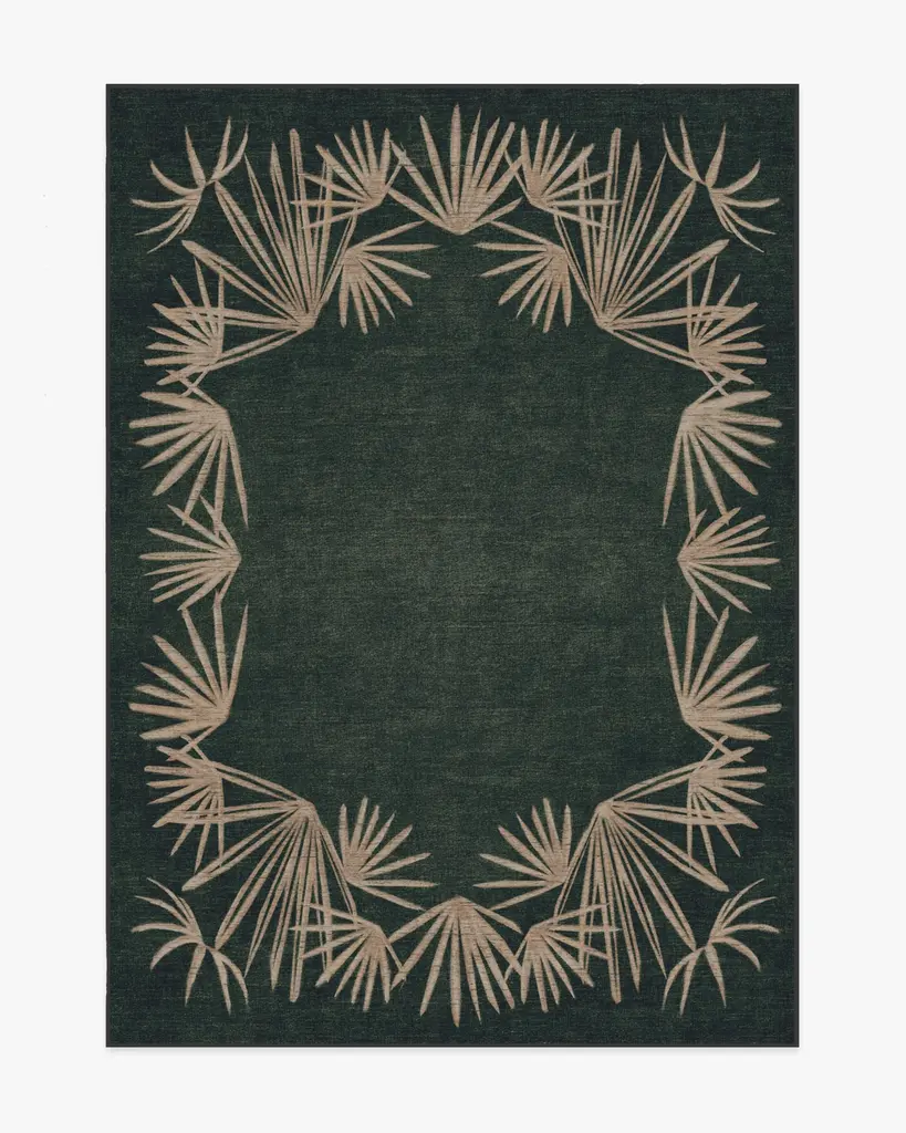 Beautiful. Breezy. Boho. Inspired by the swaying palm trees in Elysian Valley, Justina's former home, our Justina Blakeney Tarsila Forest Rug borrows artistic influence from Brazilian painter Tarsila de Aguiar do Amaral. The rich forest green background is surrounded by natural, warm palm motifs that bring serenity and style to any space. Water-resistant, stain-resistant, and machine-washable. Rug colors may vary slightly according to your device and the lighting in your space.