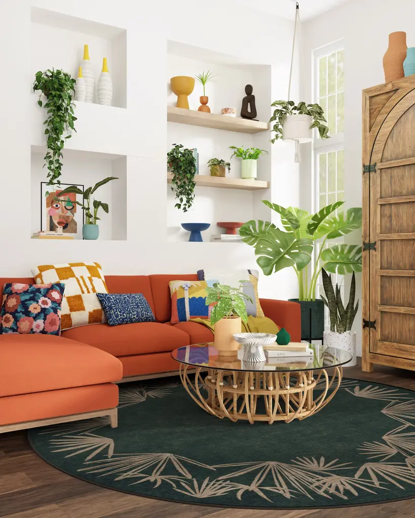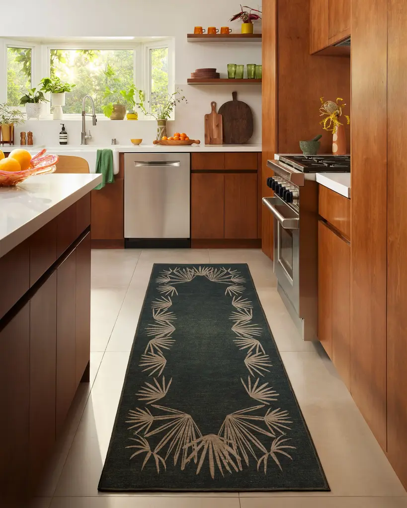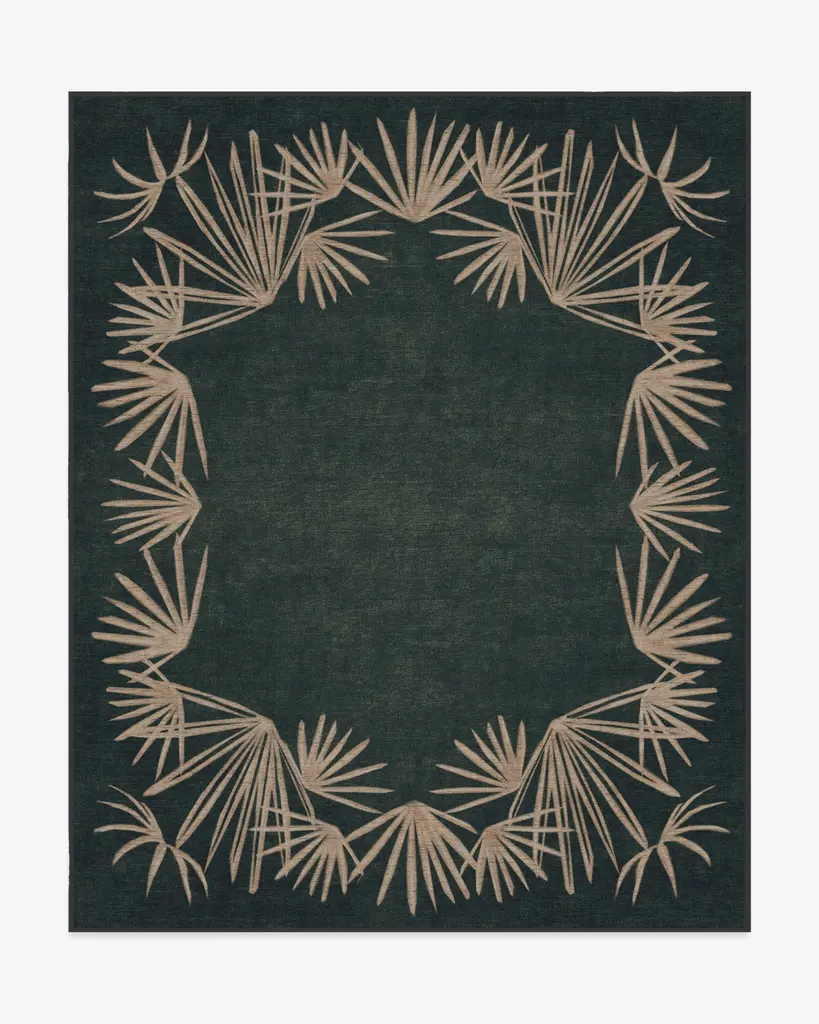 Beautiful. Breezy. Boho. Inspired by the swaying palm trees in Elysian Valley, Justina's former home, our Justina Blakeney Tarsila Forest Rug borrows artistic influence from Brazilian painter Tarsila de Aguiar do Amaral. The rich forest green background is surrounded by natural, warm palm motifs that bring serenity and style to any space. Water-resistant, stain-resistant, and machine-washable. Rug colors may vary slightly according to your device and the lighting in your space.