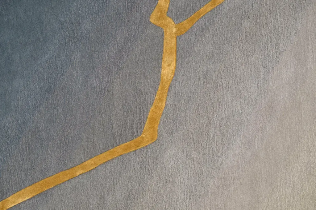 The K-3 hand-tufted rug displayed here exhibits a sophisticated gradient of gray hues, seamlessly transitioning from deep charcoal to a soft, silvery tone. The craftsmanship is highlighted by an ornate gold Kintsugi-inspired pattern, which gracefully meanders across the rug, akin to rivulets of molten gold. Kintsugi, an ancient Japanese art form, celebrates the beauty of repair and restoration, embodying the philosophy that there is elegance in imperfection and strength in recovery. This unique design element not only adds visual interest but also imbues the rug with a sense of history and resilience, transforming a traditional piece into a modern work of art that pays homage to the timeless art of Kintsugi.