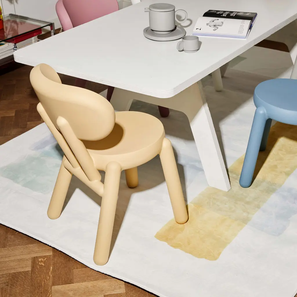 Round as a cartoon speech-bubble and twice as friendly, Kaboom turns everyday seating into a small celebration. Its smooth, seamless shell is rotationally molded in the Netherlands—an extra-thick, hollow form that feels reassuringly solid yet weighs almost nothing to lift. Sink in and the generous curves support you from every angle, whether you’re lingering over dinner, scrolling through a playlist, or catching up with friends till the candles burn low. Thanks to UV-stable, weather-proof polyethylene, Kaboom drifts effortlessly between indoors and out: pulled up to a dining table, waiting in the hallway, or greeting sunrise on the balcony. The shell wipes clean with a damp cloth and shrugs off rain, so you can leave it on the patio year-round without a second thought. Its playful silhouette suits modern lofts as easily as eclectic gardens—wherever you need a pop of character that doubles as serious comfort. Dutch duo Studio Roderick Vos designed Kaboom to make people smile first and ask questions later. Each chair is produced in small batches, emerging from its mold with a soft ‘kaboom’ that signals another unique piece ready for a lifetime of moving—from home to home, room to room, season to season.