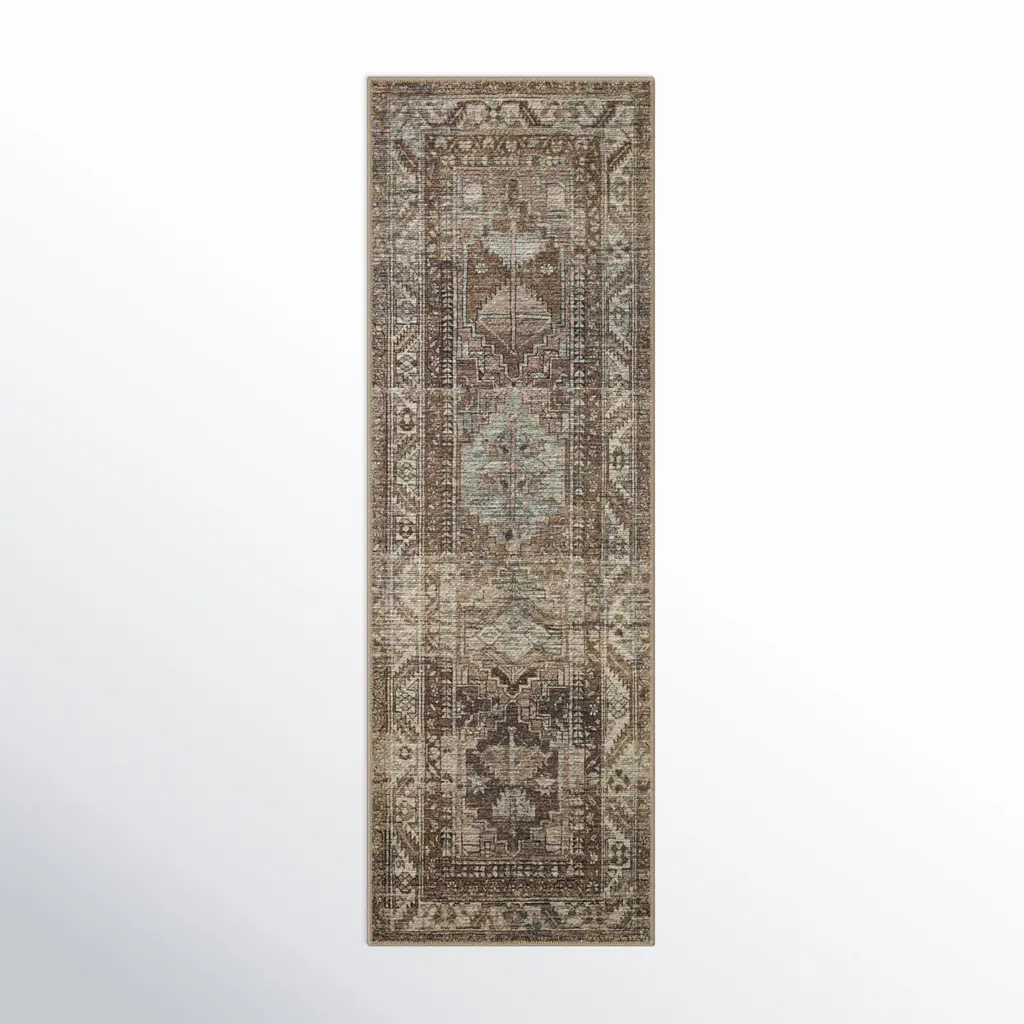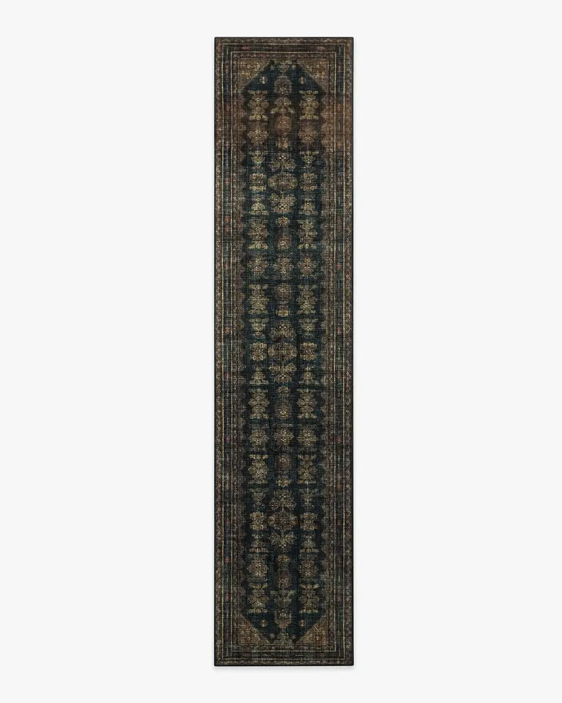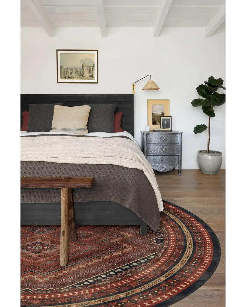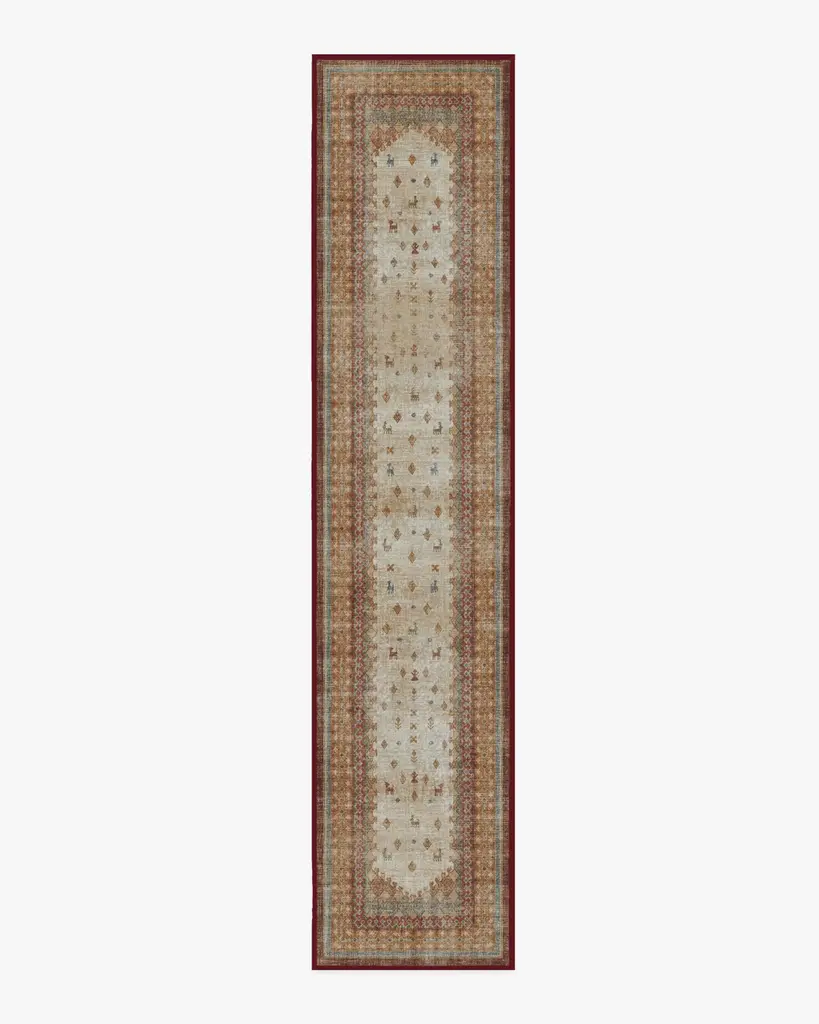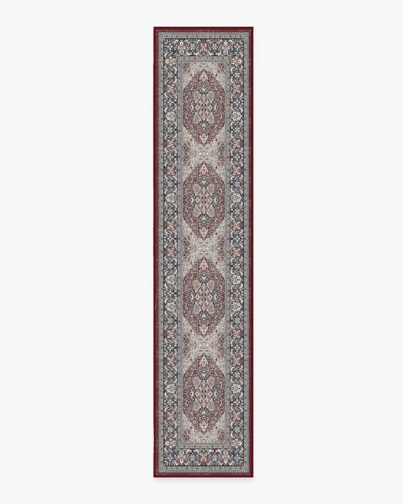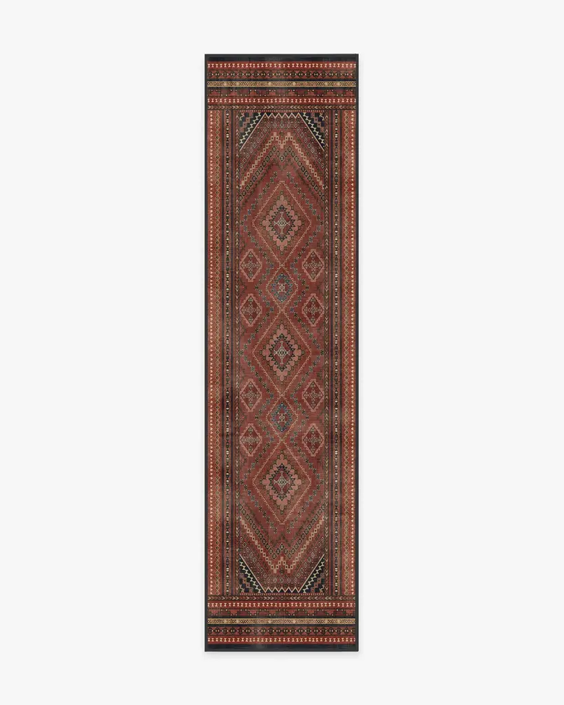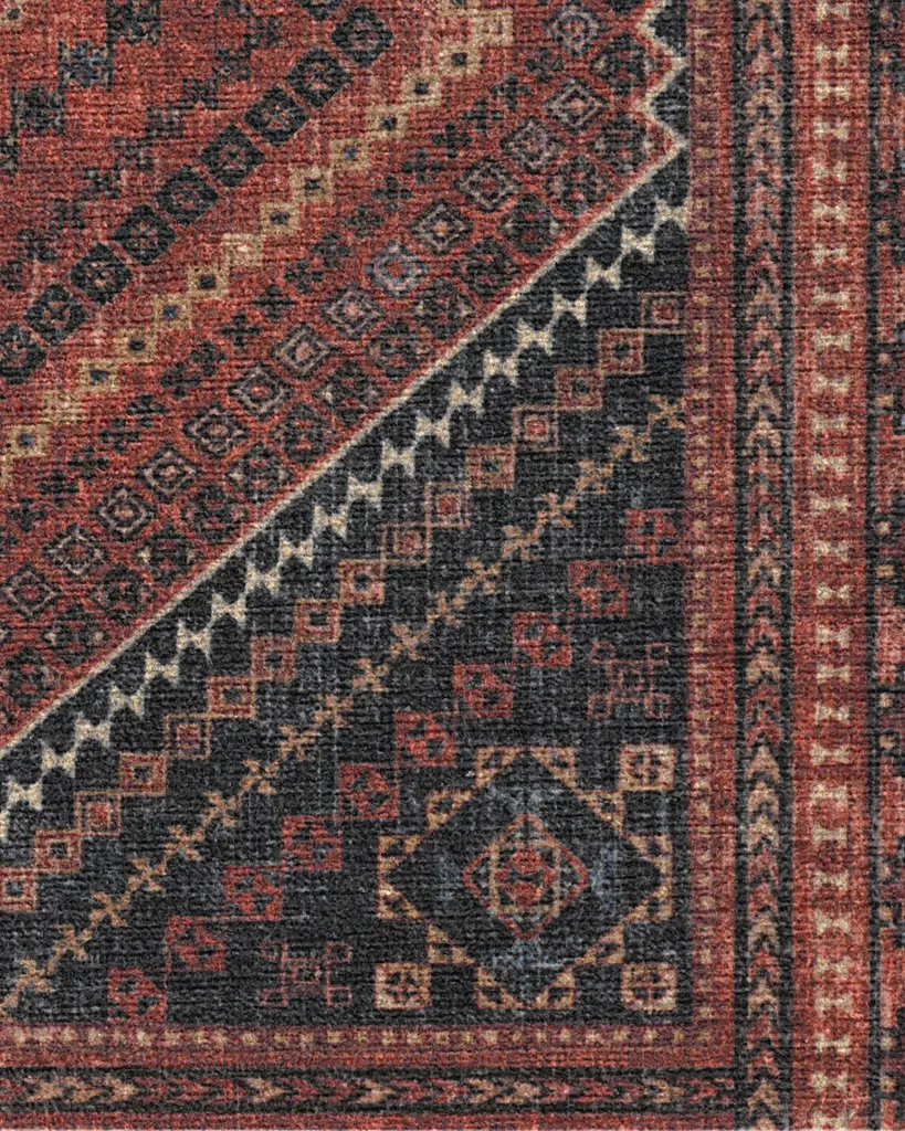 Geometric meets traditional. This rug features a central diamond medallion surrounded by repeating shapes in shades of deep vintage reds and pops of blue, coral, and gold. Water-resistant, stain-resistant, and machine-washable.