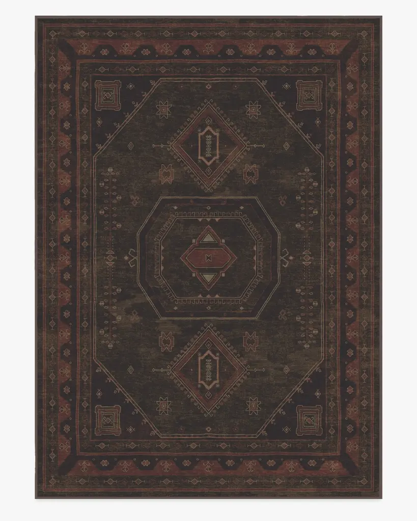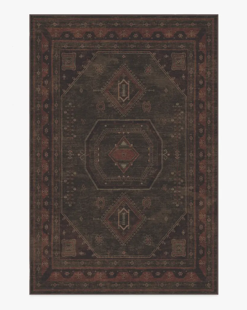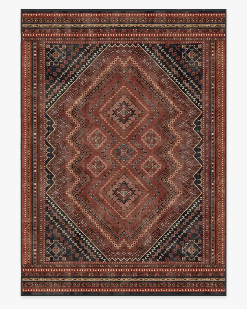Geometric meets traditional. This rug features a central diamond medallion surrounded by repeating shapes in shades of deep vintage reds and pops of blue, coral, and gold. Water-resistant, stain-resistant, and machine-washable.