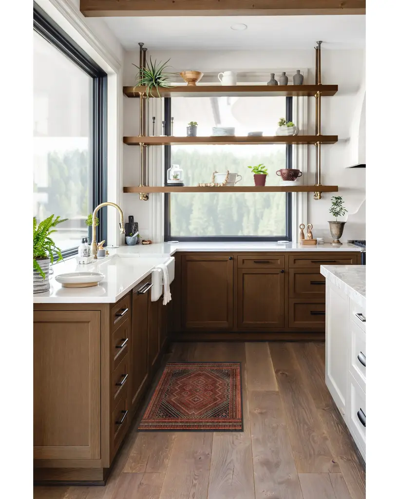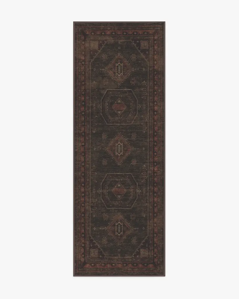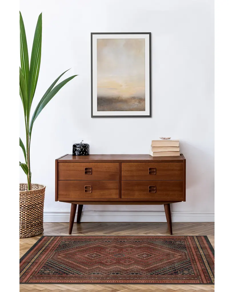 Geometric meets traditional. This rug features a central diamond medallion surrounded by repeating shapes in shades of deep vintage reds and pops of blue, coral, and gold. Water-resistant, stain-resistant, and machine-washable.