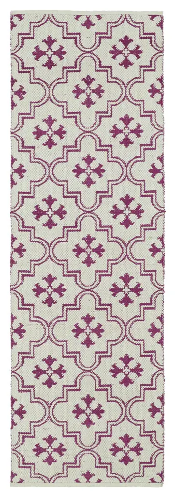Grab your favorite drink, then kick back and relax with this exciting new Indoor/Outdoor flat-weave rug from our Brisa Collection. Completely transform your indoor and outdoor living space with this double-sided rug for years to come. All of these beautiful rugs feature two unique color options to choose from because of the innovative positive/negative color weaving technique. Each rug is handmade in India with 100% PET (recycled) Polyester. Detailed colors for this rug are Purple, Ivory.
