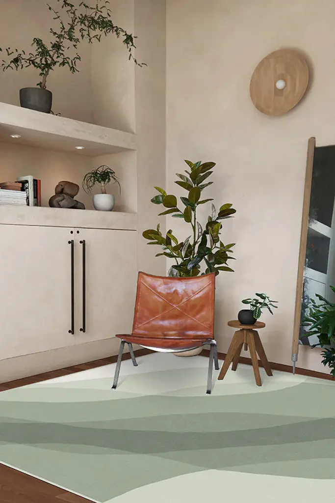 Keep your space earthy and elegant with our Kallan Sage Green Rug. Translucent shapes in shades of sage green organically overlap and flow through each other against a light cream background, allowing this design to feel effortless, eye-catching, and bold. Water-resistant, stain-resistant, and machine-washable. Rug colors may vary slightly according to your device and the lighting in your space.