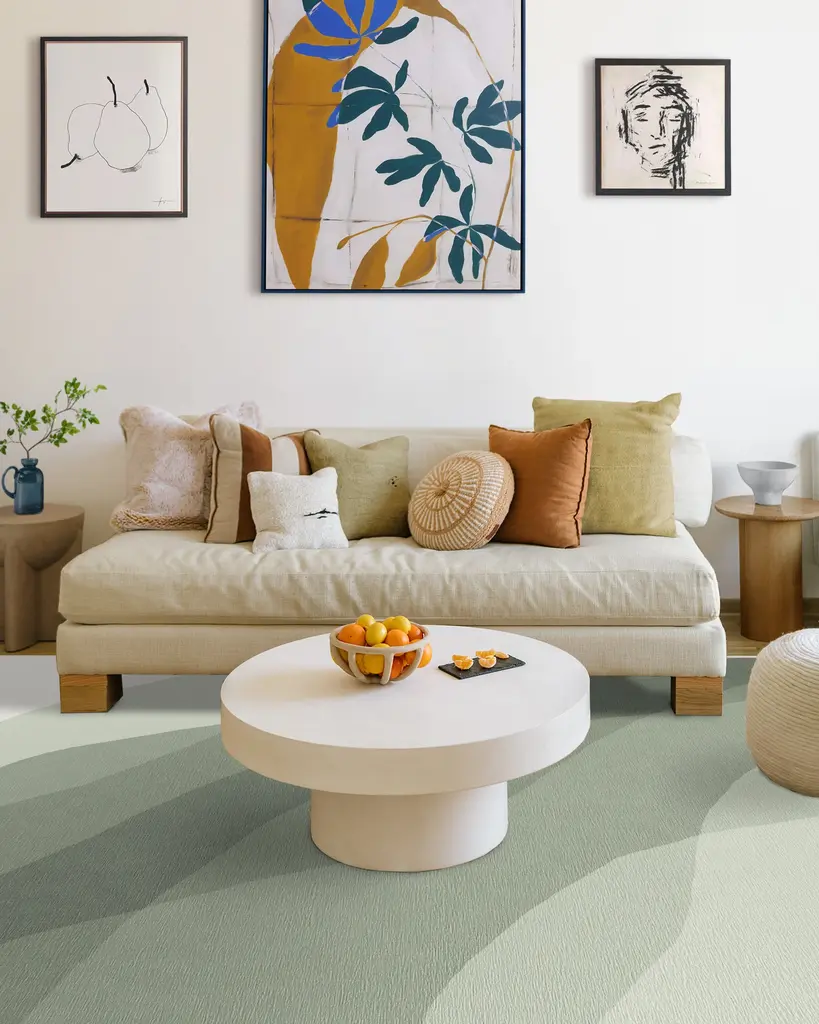 Keep your space earthy and elegant with our Kallan Sage Green Rug. Translucent shapes in shades of sage green organically overlap and flow through each other against a light cream background, allowing this design to feel effortless, eye-catching, and bold. Water-resistant, stain-resistant, and machine-washable. Rug colors may vary slightly according to your device and the lighting in your space.