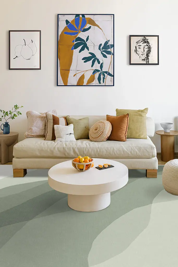 Keep your space earthy and elegant with our Kallan Sage Green Rug. Translucent shapes in shades of sage green organically overlap and flow through each other against a light cream background, allowing this design to feel effortless, eye-catching, and bold. Water-resistant, stain-resistant, and machine-washable. Rug colors may vary slightly according to your device and the lighting in your space.