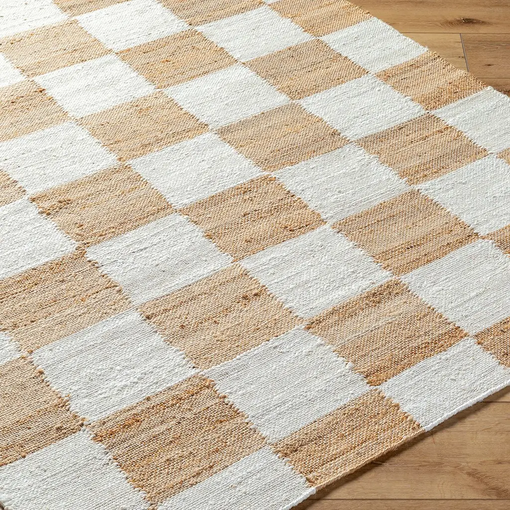 Introducing the Kamey handmade rug, an exclusive collaboration between Becki Owens and Surya, that exudes a Country Cottage style. This rug showcases a bold, large checkerboard pattern that is sure to command attention in any space. Made of Jute in India, its main colors are classic neutral tones of sandy brown and off-white which can seamlessly blend with your existing decor. The handwoven construction gives it a unique character and charm. It has no pile design for easy maintenance and we recommend using it with a rug pad to prevent slippage. With care instructions as simple as spot cleaning with water only, this rug is not just stylish but also practical for everyday use.