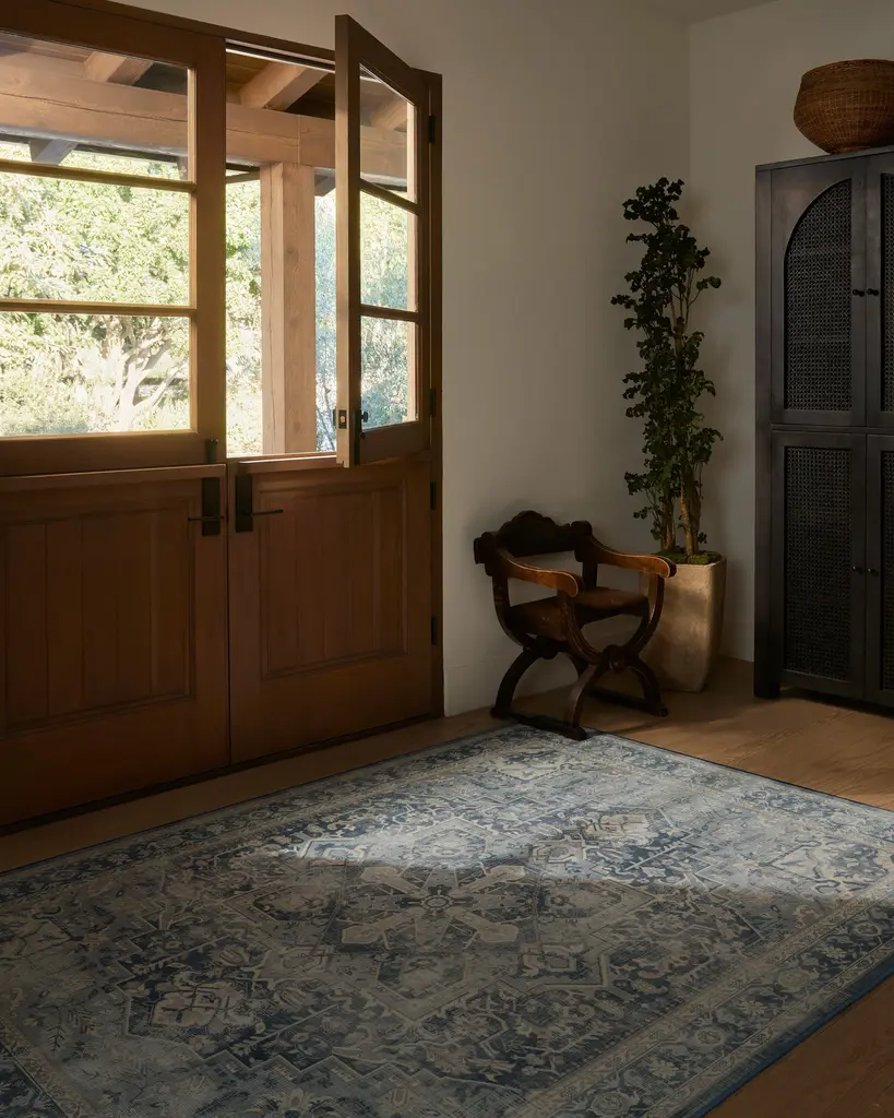 Cool and refreshing, our Kamran Admiral Blue Rug brings a distressed sophistication to a classic, Persian-inspired design. Based on traditional Heriz styles, this rug features a bold geometric pattern with a large medallion and ornate border. With a striking bold navy design that combines chambrays and soft grey tones, it's purposefully distressed for that weathered, rustic look. Water-resistant, stain-resistant, and machine-washable.