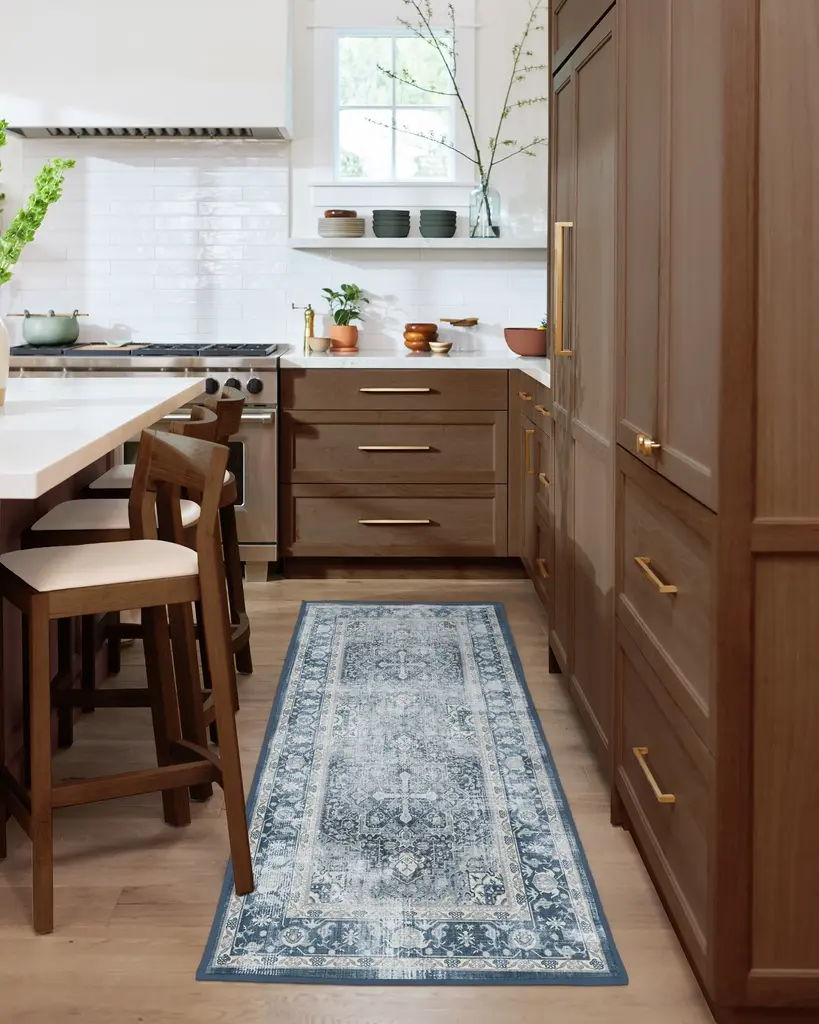 Cool and refreshing, our Kamran Admiral Blue Rug brings a distressed sophistication to a classic, Persian-inspired design. Based on traditional Heriz styles, this rug features a bold geometric pattern with a large medallion and ornate border. With a striking bold navy design that combines chambrays and soft grey tones, it's purposefully distressed for that weathered, rustic look. Water-resistant, stain-resistant, and machine-washable.
