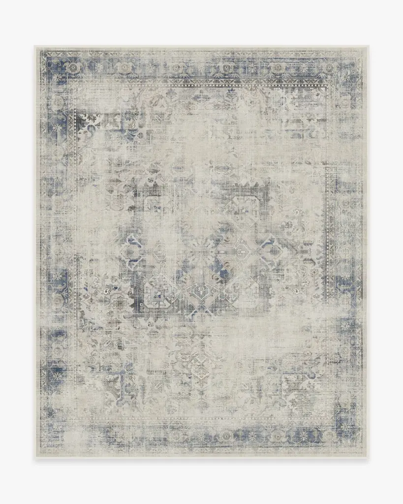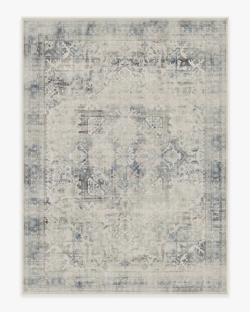 An upscale, elegant statement maker. This best-selling design gets a color update with shades slate and denim blue, teal, grey, and latte brown on our Kamran Blue Quartz Rug. The large medallion and ornate border is inspired by traditional Heriz rugs and has a vintage look that will complement a variety of decor. Water-resistant, stain-resistant, and machine-washable.