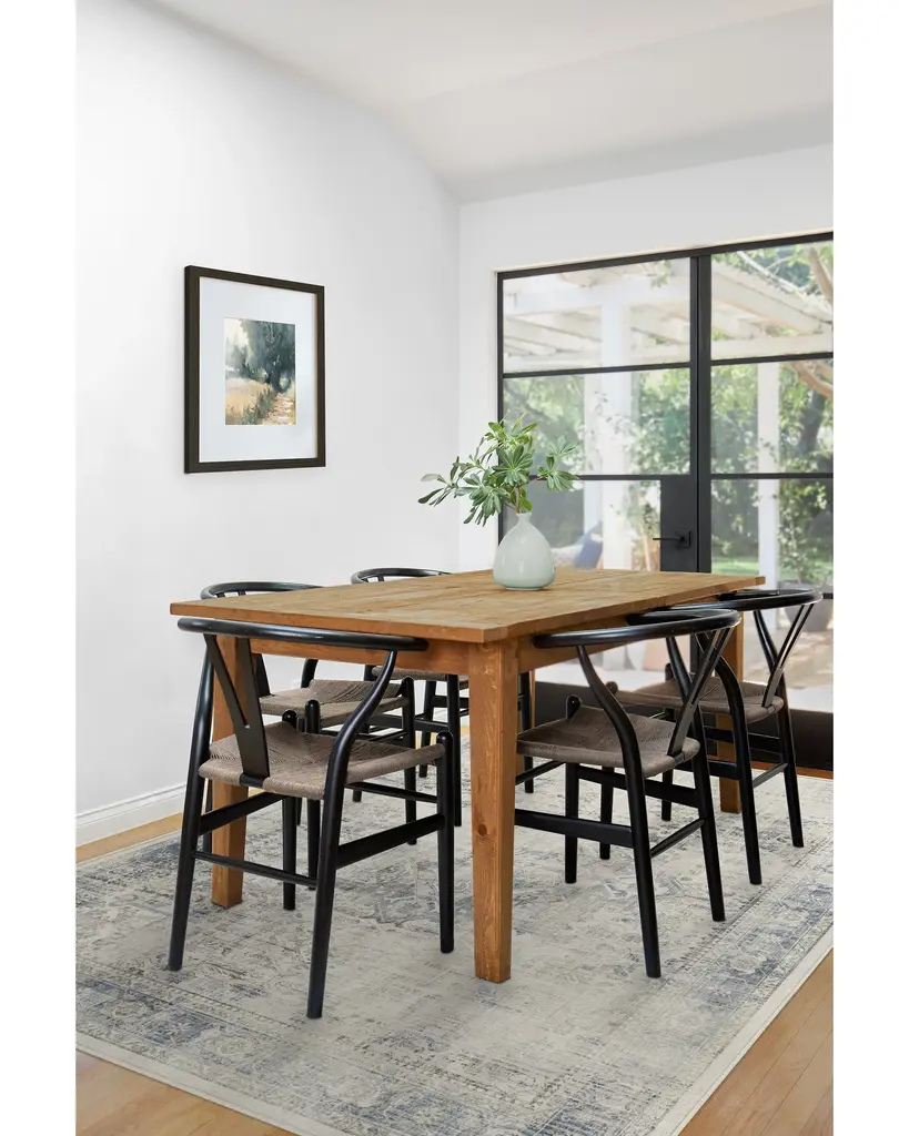 An upscale, elegant statement maker. This best-selling design gets a color update with shades slate and denim blue, teal, grey, and latte brown on our Kamran Blue Quartz Rug. The large medallion and ornate border is inspired by traditional Heriz rugs and has a vintage look that will complement a variety of decor.