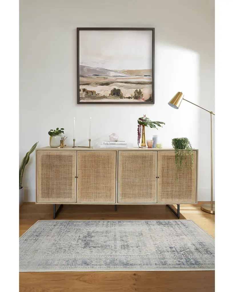 An upscale, elegant statement maker. This best-selling design gets a color update with shades slate and denim blue, teal, grey, and latte brown on our Kamran Blue Quartz Rug. The large medallion and ornate border is inspired by traditional Heriz rugs and has a vintage look that will complement a variety of decor. Water-resistant, stain-resistant, and machine-washable.
